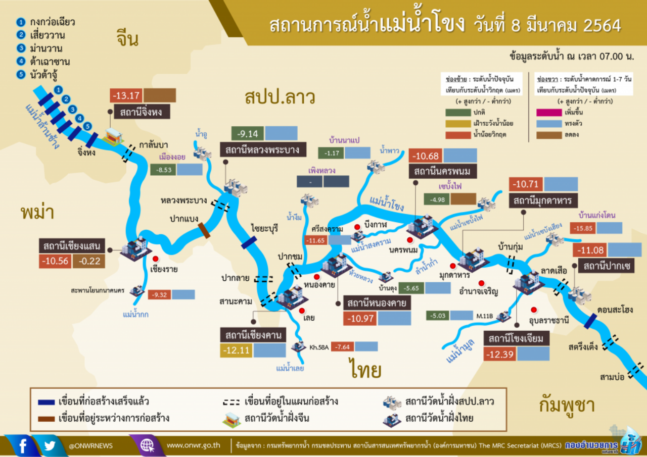 จากข้อมูลรายงานของสำนักงานวิจัยพัฒนาและอุทกวิทยา ที่เก็บข้อมูลปริมาณน้ำที่ไหลในลุ่มแม่น้ำโขง ผ่าน 6 สถานี ประกอบด้วย 1.แม่น้ำโขงเชียงแสน จ.เชียงราย 2.แม่น้ำโขงเชียงคาน จ.เลย 3.แม่น้ำโขงหนองคาย 4.แม่น้ำโขง จ.นครพนม 5.แม่น้ำโขง จ.มุกดาหาร และ 6.แม่น้ำโขงเจียม อ.โขงเจียม จ.อุบลราชธานี