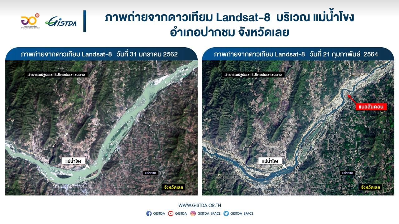 โดย เมื่อช่วงต้นเดือนมีนาคมที่ผ่านมา สำนักงานพัฒนาเทคโนโลยีอวกาศและภูมิสารสนเทศ หรือ GISTDA ได้เผยภาพดาวเทียม Landsat-8 ที่ส่องบริเวณแม่น้ำโขง ช่วง อำเภอปากชม จังหวัดเลย ซึ่งเป็นภาพถ่ายเปรียบเทียบ เมื่อช่วงเดือนมกราคมของปี พ.ศ.2562 และ พ.ศ.2564 แสดงให้เห็นถึงปริมาณน้ำในแม่น้ำโขงที่ลดลงอย่างเห็นได้ชัดเจน จนปรากฏสันดอนทรายโผล่กลางแม่น้ำ รวมถึงริมตลิ่งของพื้นที่ทั้งสองฝั่งตลอดแนวลำน้ำทั้งในอำเภอปากชม จังหวัดเลย และพื้นที่อื่นๆ