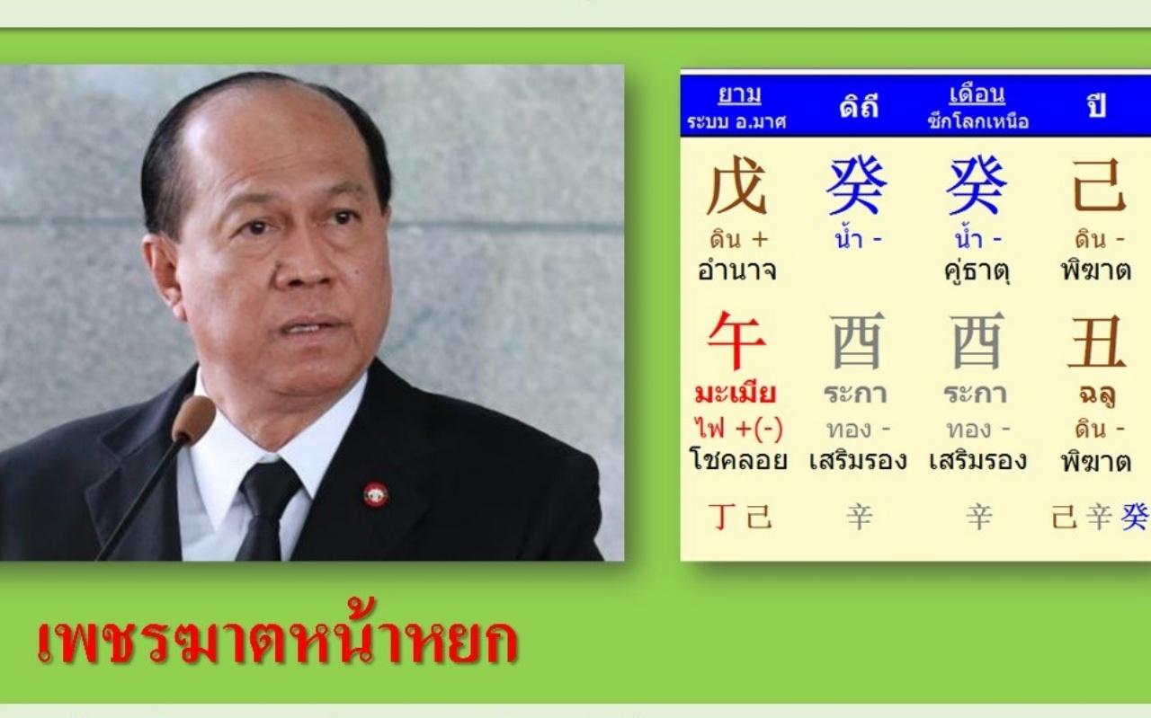 ต่างจาก “บิ๊กป้อม” ดวงเป็นธาตุน้ำหยาง ซึ่งเป็นน้ำใหญ่หรือน้ำมหาสมุทร ครองพื้นที่ส่วนใหญ่ของผิวโลก หรือหมายถึงเป็นหัวหน้าพรรคพลังประชารัฐ ครองเสียง ส.ส. ส่วนใหญ่เอาไว้ หากเกิดความขัดแย้ง เมื่อไฟคิดจะสู้น้ำ อาจโดนคลื่นยักษ์สึนามิ เล่นงานล้มกระดานทันที สุดท้ายก็เสียหายทั้งสองฝ่าย