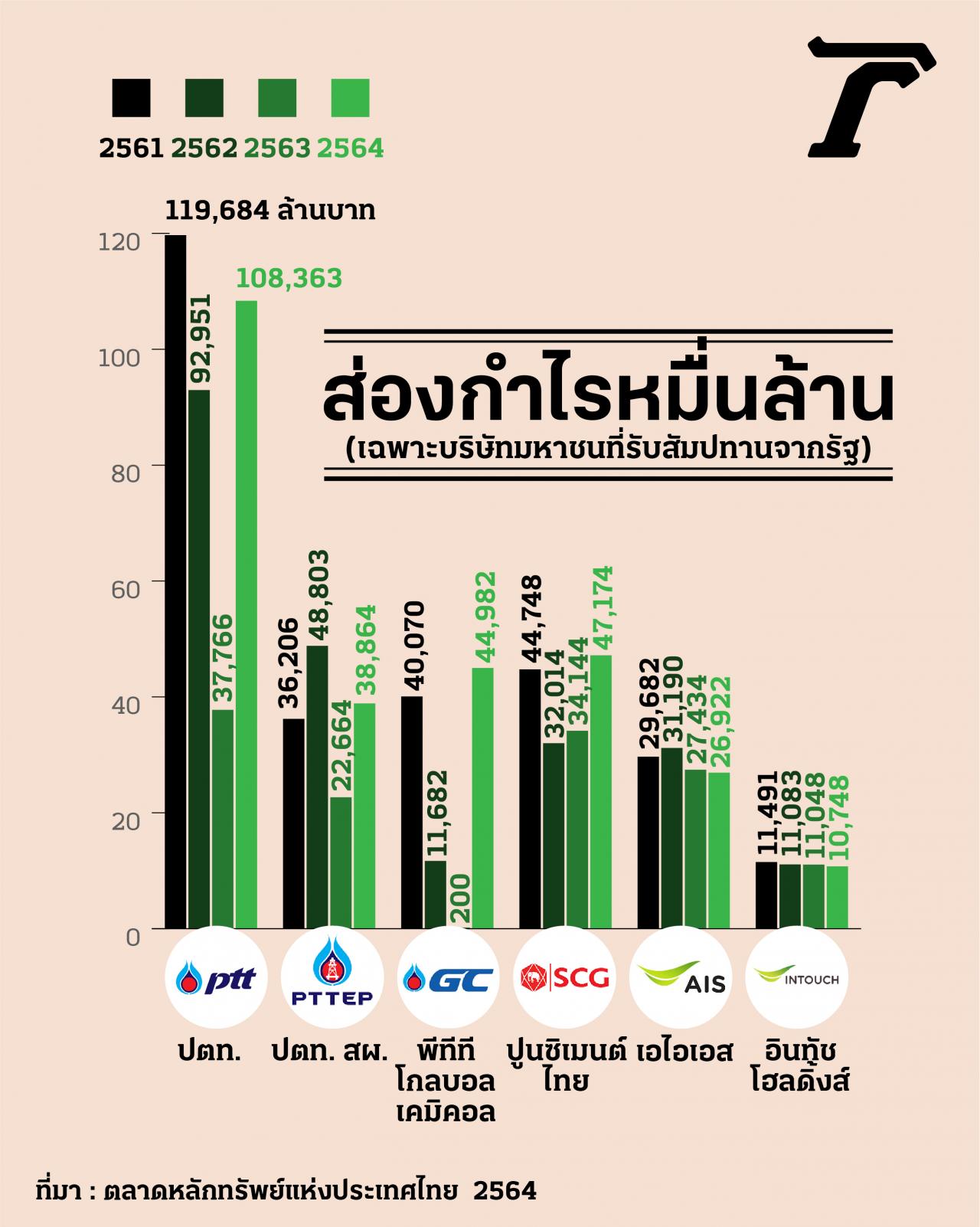 แล้วกำไรของผู้ประกอบการรายใหญ่มีมากแค่ไหน ทีมข่าวไทยรัฐออนไลน์ ลองสำรวจข้อมูลของบริษัทขนาดใหญ่ในไทย ในกลุ่มบริษัทที่แจ้งต่อตลาดหลักทรัพย์แห่งประเทศไทย ว่ามีสัมปทานจากรัฐ หรือเป็นคู่สัญญากับรัฐ ที่มีกำไรในหลักหมื่นล้านบาทขึ้นไป ย้อนหลังไป 4 ปีนั้น ทั้งกลุ่มขนส่ง พลังงาน สื่อสารโทรคมนาคม ก่อสร้าง ส่วนใหญ่ยังมีกำไร แต่อยู่ในระดับหลักร้อยล้าน และพันล้านบาท มีเพียงไม่กี่บริษัทที่มีกำไรเกินหลักหมื่นล้านบาท
