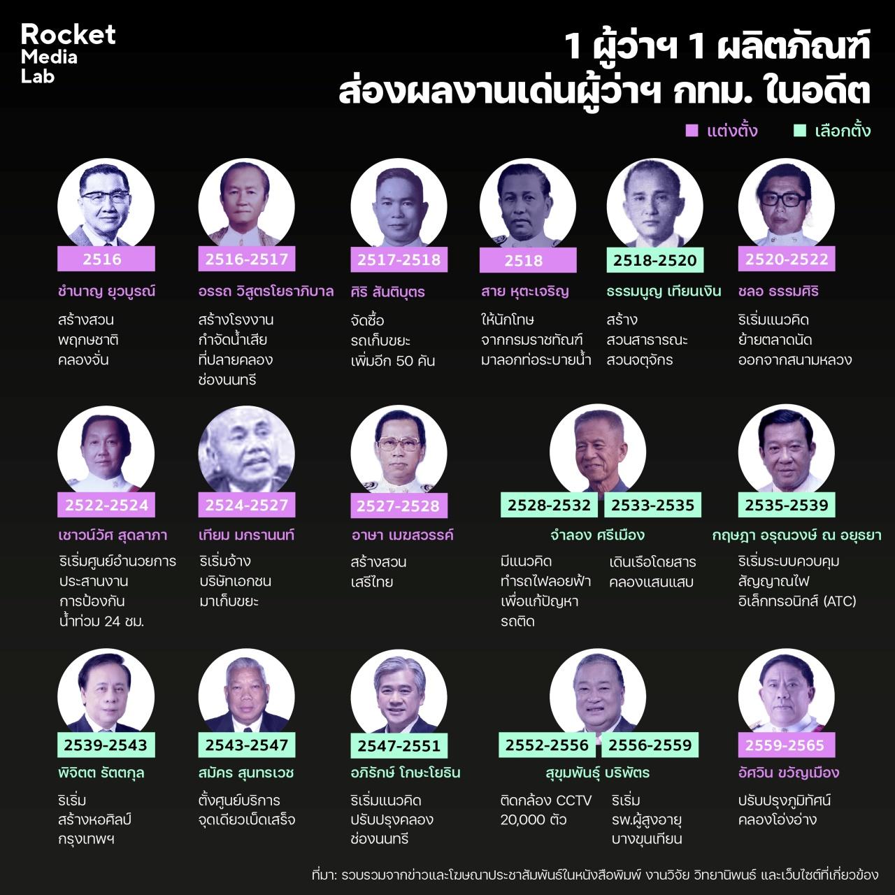 ข้อมูลจาก "Rocket Media Lab" ชวนย้อนสำรวจดูผลงานเด่นของผู้ว่าฯ กทม. ในแต่ละยุค เพื่อดูว่าแท้จริงแล้ว ผลงานของผู้ว่าฯ มีที่มาที่ไปอย่างไรกันแน่