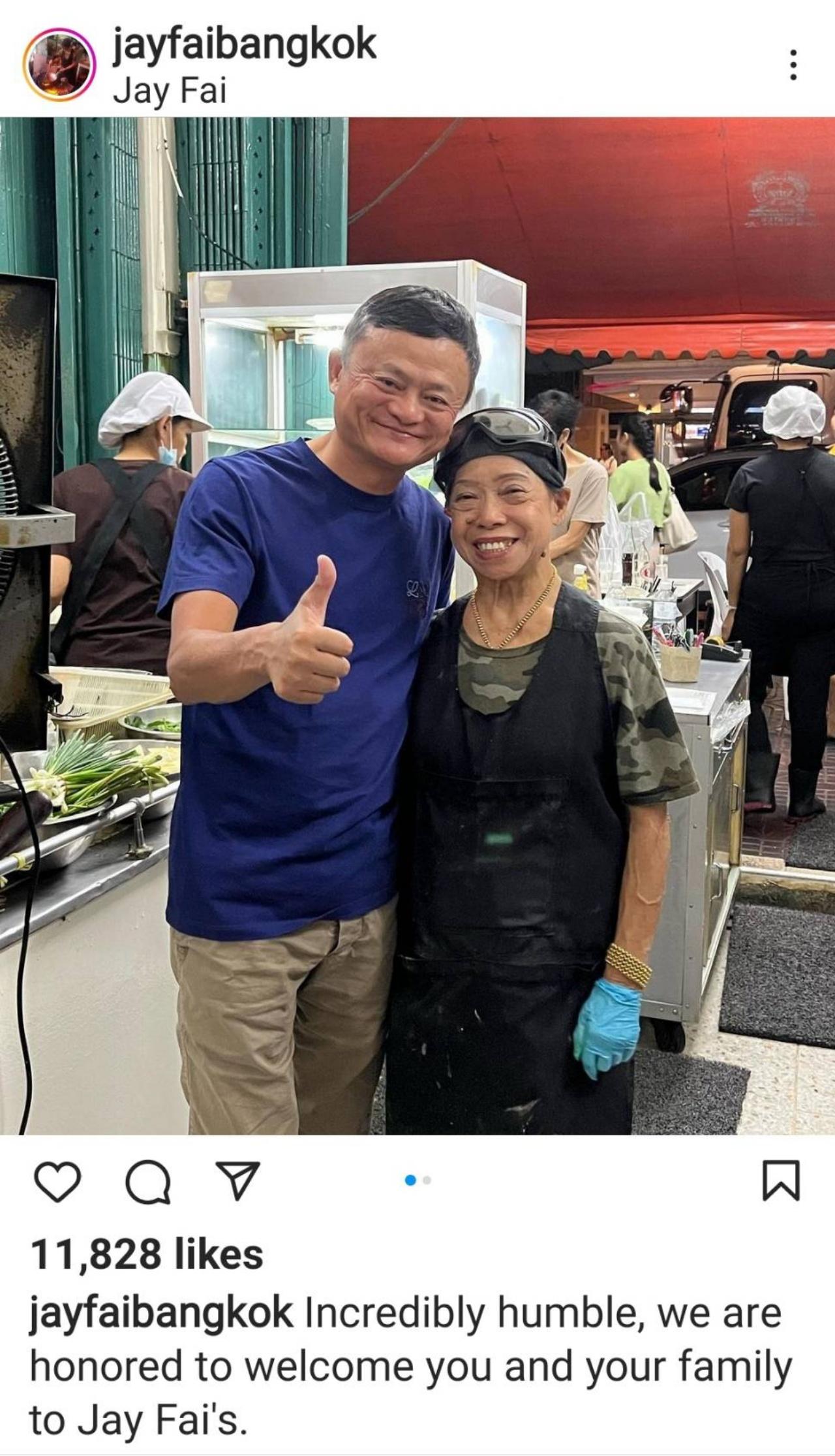 ที่มาของภาพที่เป็นหลักฐาน การปรากฏตัวของ แจ็ค หม่า อยู่ในเมืองไทยนั้น มีจุดเริ่มต้นเมื่อช่วงเย็นของวันที่ 6 ม.ค. 2566 อินสตาแกรม หรือไอจี เจ๊ไฝ jayfaibangkok ร้านอาหารชื่อดังระดับดาวมิชลิน ได้โพสต์ภาพ คู่แจ็ค หม่า และเจ๊ไฝ โดยแจ็ค หม่าสวมเสื้อยืดสีน้ำเงิน ยกนิ้วสัญลักษณ์ไลค์ หรือชื่นชอบ และเจ๊ไฝในชุดทำอาหารที่คุ้นตาอยู่แล้ว นอกจากนี้ยังมีอีกภาพที่เห็นด้านหลังแจ็ค หม่า โค้งพร้อมยกมือไหว้สวัสดีเจ๊ไฝ พร้อมแคปชั่นสรุปเป็นภาษาไทยว่า ยินดีต้อนรับคุณและครอบครัว พร้อมทั้งยังชื่นชมในความถ่อมตนของแจ็ค หม่า อีกด้วย