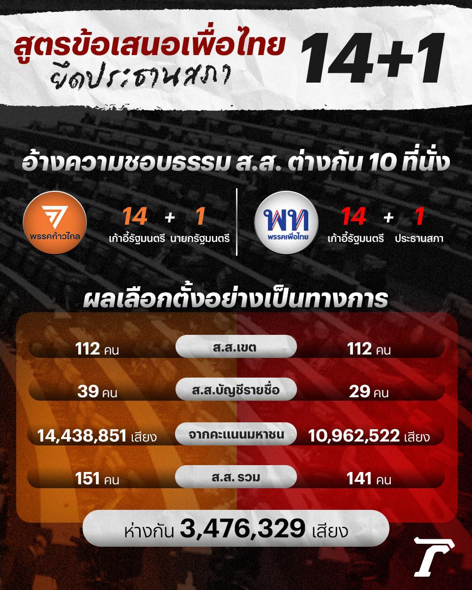 สูตร 14+1 ข้อเสนอจากคณะเจรจาพรรคเพื่อไทย จะนำเข้าที่ประชุมระหว่างสองพรรคในวันที่ 28 มิ.ย.นี้ อ้างว่าเป็นความชอบธรรม มีเหตุมีผลในการจัดตั้งรัฐบาล เนื่องจากจำนวน ส.ส. ต่างกันเพียง 10 ที่นั่งเท่านั้น แต่ความเป็นไปได้อาจยากที่พรรคก้าวไกล จะยอมรับได้ เพราะต้องการเก้าอี้ประธานสภาเช่นกัน ในฐานะพรรคอันดับ 1