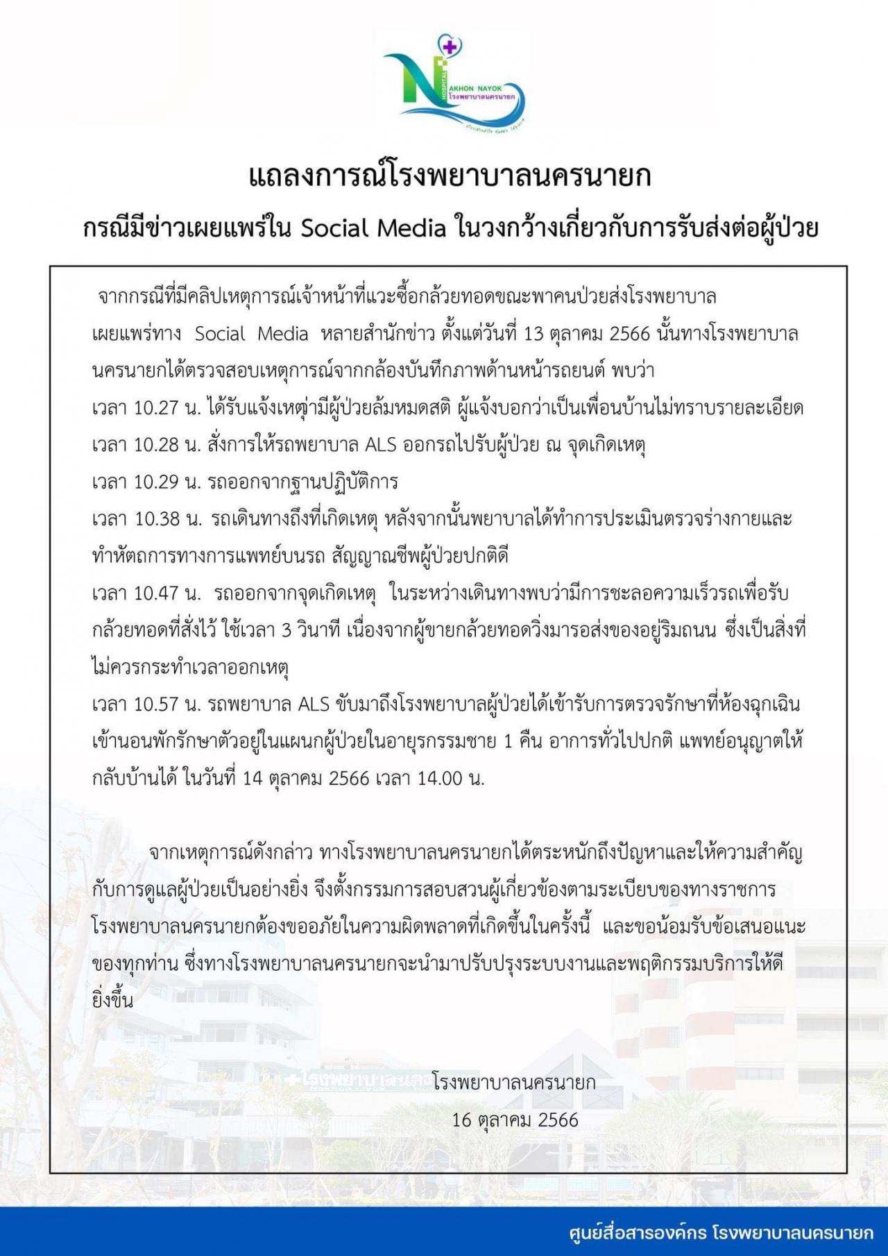 หลังโรงพยาบาลได้ตรวจสอบบุคลากรทางการแพทย์ มีการชี้แจงผ่านเพจเฟซบุ๊กโรงพยาบาลนครนายกว่า กรณีที่มีคลิปเหตุการณ์เจ้าหน้าที่แวะซื้อกล้วยทอดขณะพาผู้ป่วยส่งโรงพยาบาล ตั้งแต่ 13 ต.ค.ที่ผ่านมา โรงพยาบาลได้ตรวจสอบจากกล้องบันทึกภาพด้านหน้ารถ พบว่า