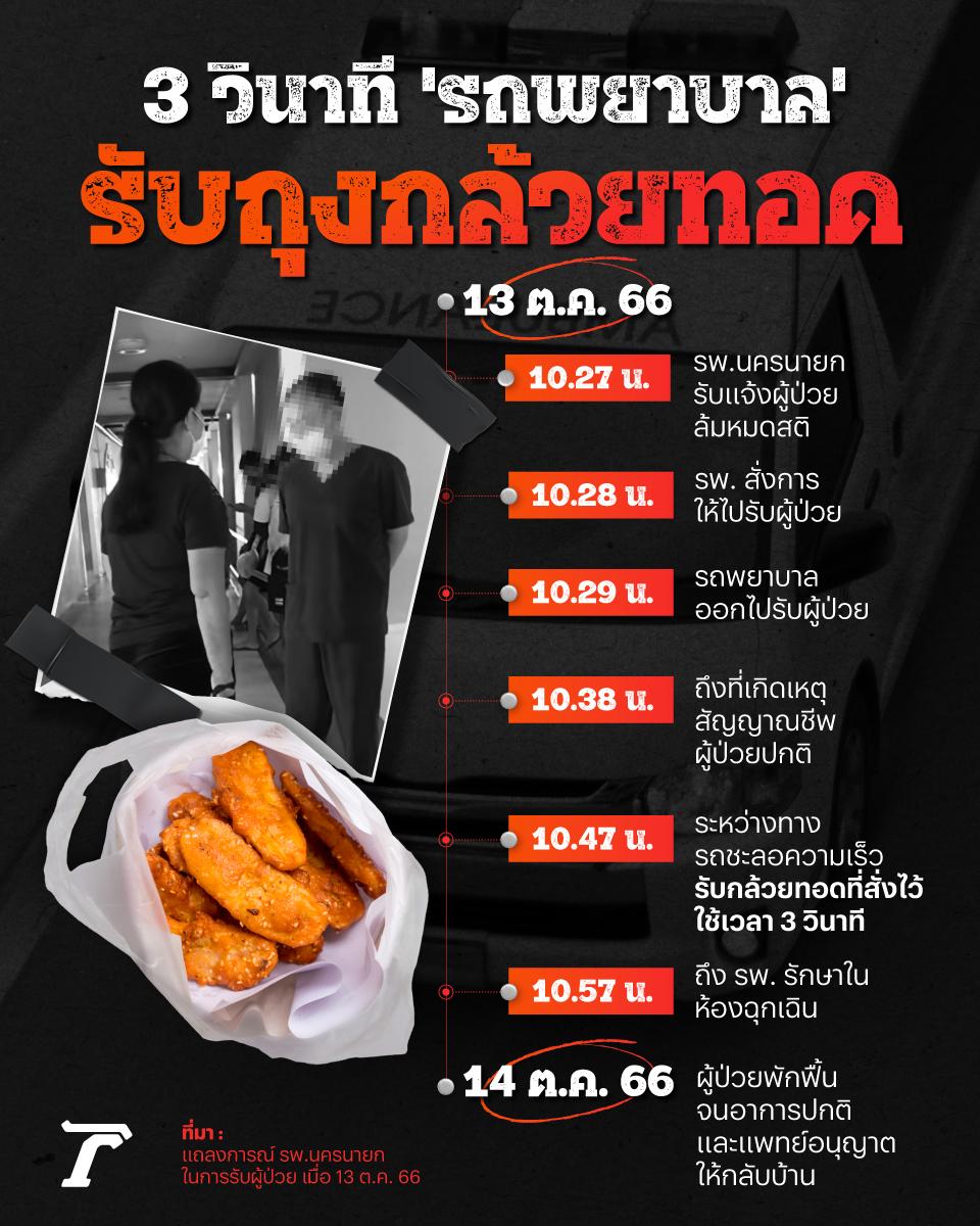 โรงพยาบาลแจงดราม่า รถพยาบาลรับถุงกล้วยทอดระหว่างลำเลียงผู้ป่วยฉุกเฉินส่งหมอ เผยไทม์ไลน์ใช้เวลา 3 วินาที ชะลอรถรับถุงกล้วยทอดจากแม่ค้า แถลงยอมรับเป็นสิ่งไม่ควรทำ พร้อมปรับปรุงบริการ พร้อมเปิดไทม์ไลน์การรักษาตั้งแต่วินาทีรับตัว ด้านกู้ภัยมองเรื่องนี้ไม่น่าจะเกิดขึ้น