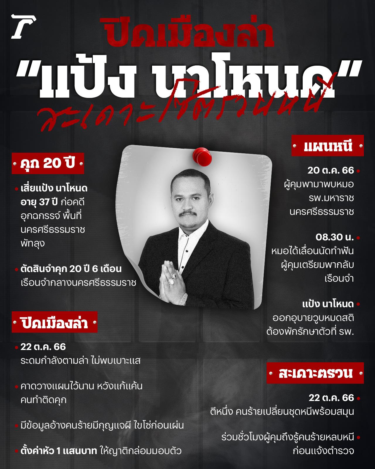 เสี่ยแป้ง นาโหนด อายุ 37 ปี ก่อคดีอุกฉกรรจ์ พื้นที่นครศรีธรรมราช พัทลุง เคยมีประวัติพาผู้ต้องหาหลบหนีคดีมาแล้ว โดยถูกคุมขังในเรือนจำกลางนครศรีธรรมราช 20 ปี 6 เดือน เมื่อวันที่ 20 ต.ค. 66 ผู้คุมพามาพบหมอ รพ.มหาราชนครศรีธรรมราช พอเวลา 08.30 น. หมอได้เลื่อนนัดทำฟัน ผู้คุมเตรียมพากลับเรือนจำ แต่ แป้ง นาโหนด ออกอุบายวูบหมดสติ ต้องพักรักษาตัวต่อที่ รพ.