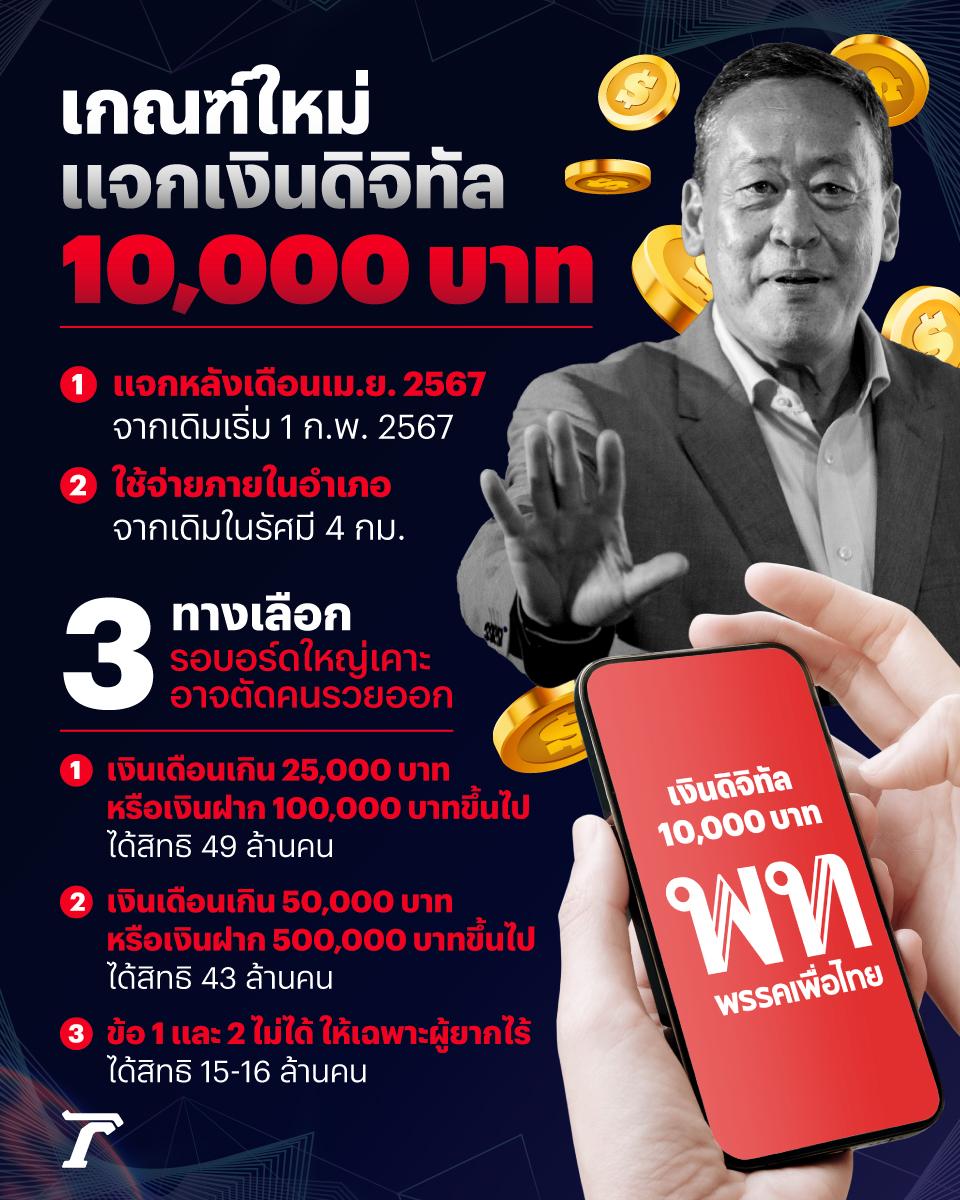 นโยบายแจกเงินดิจิทัลวอลเล็ต 1 หมื่นบาท ให้กับคนอายุ 16 ปีขึ้นไป จำนวน 56 ล้านคน ใช้งบมหาศาล 5.6 แสนล้านบาท ไม่น่าจะทำได้จากข้อจำกัดของแบงก์รัฐไม่สามารถปล่อยกู้ได้ ทำให้ที่ประชุมคณะอนุกรรมการขับเคลื่อนนโยบายเติมเงิน 10,000 บาท ผ่านดิจิทัลวอลเล็ต เมื่อวันที่ 25 ต.ค.ที่ผ่านมา ต้องปรับเกณฑ์จัดทำข้อเสนอ 3 ทางเลือกกลุ่มเป้าหมายให้คณะกรรมการชุดใหญ่พิจารณาอีกครั้ง