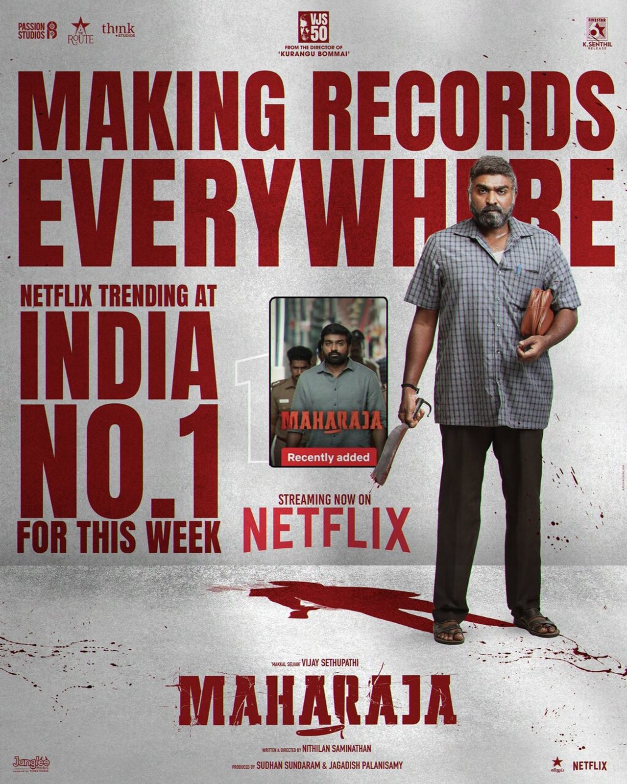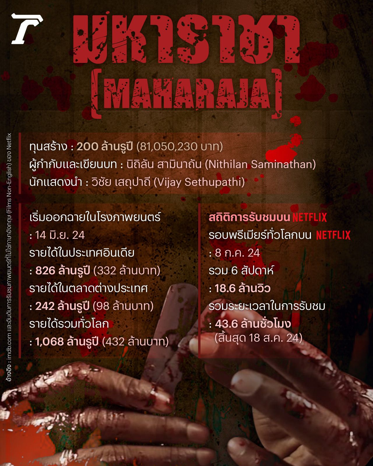 ภาพยนตร์มหาราชา (Maharaja) ซึ่งขึ้นทำเนียบ 100 Crore Club (หนังทำเงิน 1,000 ล้านรูปี ของกอลลีวูด (Kollywood) เนื่องจากเป็นภาพยนตร์ภาษาทมิฬ) ได้กลายเป็นภาพยนตร์ที่สามารถเรียกร้องความสนใจจากแฟนหนังทั่วโลกได้มากขึ้นทุกที ๆ หลังเปิดฉายในโรงภาพยนตร์รอบแรกไปเมื่อวันที่ 14 มิ.ย. 2024 และออนแอร์รอบพรีเมียร์บนแพลตฟอร์ม Netflix ไปเมื่อวันที่ 8 ก.ค. 2024