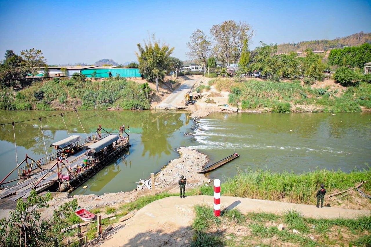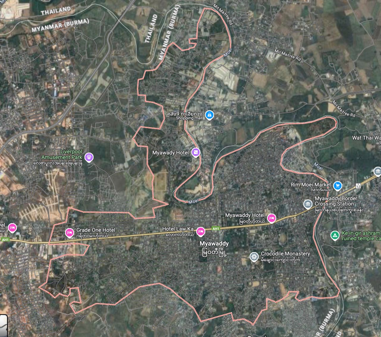 ทั่วบริเวณเต็มไปด้วยแคมป์คนงานที่ตั้งเรียงราย ที่นี่คือเมืองใหญ่เพราะเราสังเกตเห็นมีระบบการบำบัดน้ำ ทิ้งน้ำลงแม่น้ำเมย