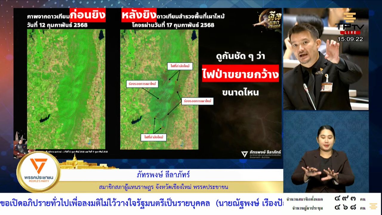 “14 ก.พ. ยิงคืนนั้นก็ไหม้คืนนั้นเลย ฮอตสปอตเจอ 2 จุดแรก จากแผนที่สันนิษฐานได้ว่าไฟป่าเกิดขึ้นในพื้นที่กระสุนตกและขยายตัวไปทางเหนือและใต้ แต่กองทัพแจงว่า ไฟป่าคนละกองกัน ห่างกัน 2 กม. เลย”