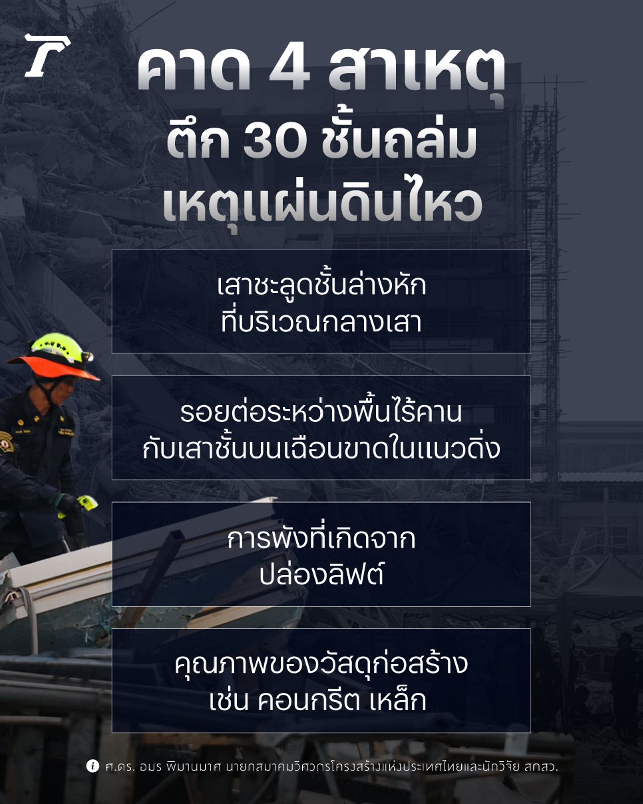 เปิด 3 ข้อสันนิษฐาน สาเหตุตึก 30 ชั้นถล่มจากเหตุแผ่นดินไหว คาดโครงสร้างหลัก “คาน-เสา” เสียหายหนัก แต่ไม่ตัดเรื่องคุณภาพวัสดุก่อสร้าง