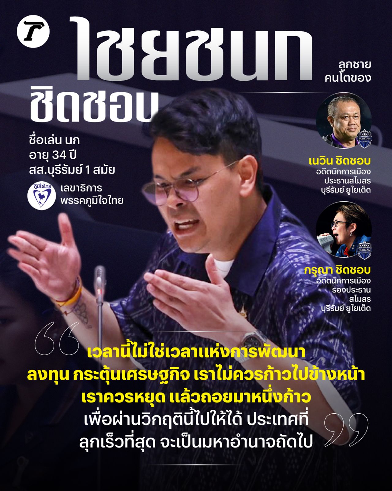 นายไชยชนก ชิดชอบ เลขาธิการพรรคภูมิใจไทย และ สส.บุรีรัมย์ ลูกชายคนโตของนายเนวิน และนางกรุณา ชิดชอบ 2 อดีตนักการเมืองชื่อดัง และผู้บริหารสโมสรบุรีรัมย์ ยูไนเต็ด ทีมแชมป์ไทยลีก คนที่เป็นที่รู้จักกันเป็นอย่างดี ในฐานะ “พ่อใหญ่” ของกลุ่มการเมือง “สีน้ำเงิน” และผู้มีอิทธิพลในแวดวงฟุตบอลไทย