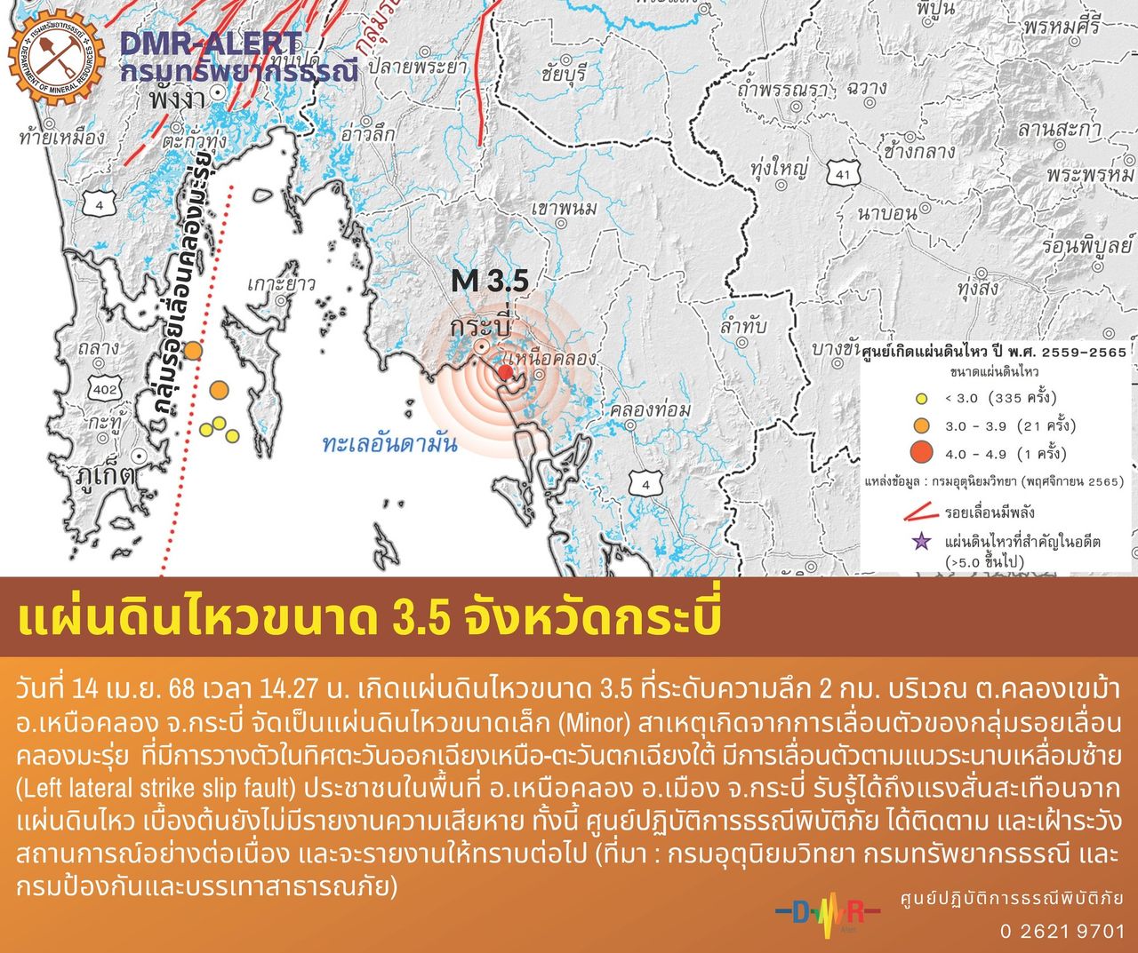 แผ่นดินไหว กระบี่ ขนาด 3.5 ความลึก 2 กม. “กรมอุตุ” ชี้เป็นแผ่นดินไหวขนาดเล็ก มีอาฟเตอร์ช็อกน้อย ไม่ทำให้เกิดสึนามิ เพราะเป็นการเคลื่อนตัวของเปลือกโลกในแนวดิ่ง