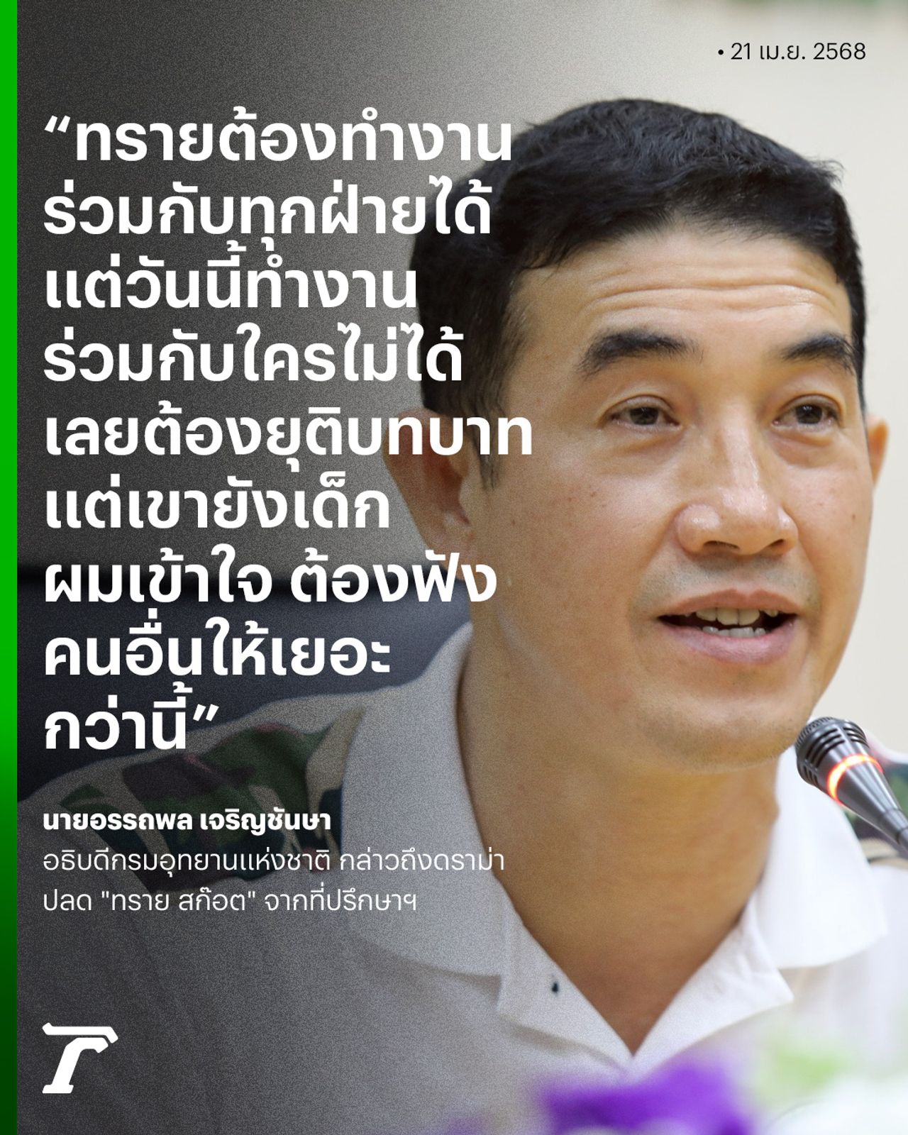 ทีมข่าวเฉพาะกิจ ไทยรัฐออนไลน์ สอบถามไปยัง นายอรรถพล เจริญชันษา อธิบดีกรมอุทยานแห่งชาติ สัตว์ป่า และพันธุ์พืช ถึงข้อเท็จจริงกรณี ทราย สก๊อต ว่า ตอนนี้ (21 เม.ย.68) ยังไม่มีคำสั่งปลด ทราย สก๊อต จากการเป็นที่ปรึกษาอย่างเป็นทางการ ตอนนี้เรื่องอยู่ที่สำนักอุทยานฯ ที่จะเสนอขึ้นมาเพื่อขอปลดจากตำแหน่งที่ปรึกษา ขณะนี้ยังไม่มีการเซ็นคำสั่ง แต่ถ้าเรื่องขึ้นมาคาดว่ามีการเซ็นคำสั่งภายในอาทิตย์นี้