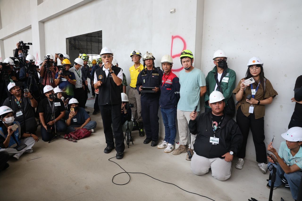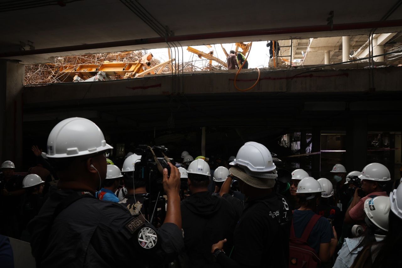 นายไทวุฒิ ขันแก้ว ผอ.สำนักการวางผังและพัฒนาเมือง และเจ้าหน้าที่ได้อธิบายเกี่ยวกับโซนค้นหา ทั้ง A B C และ D ประกอบกับการเปิดผังอาคารที่คนงานได้วิ่งหนีออกมาในช่วงที่เกิดเหตุแผ่นดินไหว จากตึก 30 ชั้น ลงมาตามบันไดหนีไฟ ซึ่งจุดนี้เองเป็นจุดที่พบผู้เสียชีวิตเป็นจำนวนมาก ก่อนจะพาสื่อลงไปที่อาคารจอดรถที่ลึกลงไป 4 เมตร พบกองคอนกรีตขนาดใหญ่ทับถมลงมาในพื้นที่โซน B ที่กำลังอยู่ระหว่างเคลียร์พื้นที่ และคาดว่าจะพบผู้ติดค้างเพิ่มเติม