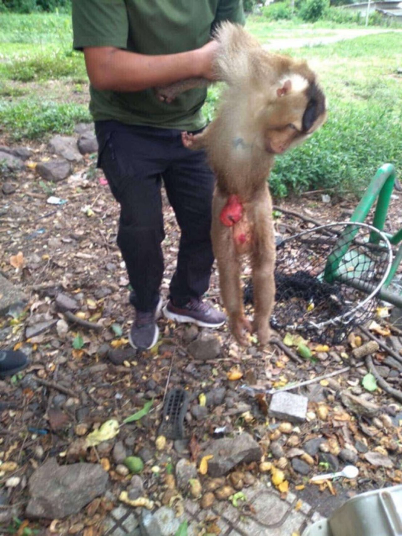 จากนั้นได้พาลิงมาที่สำนักบริหารพื้นที่อนุรักษ์ที่ 6 โดยสัตวแพทย์ของเทศบาลได้เข้ามาดูแทนเบื้องต้น ซึ่งมีความเห็นว่า ไม่สามารถชี้ชัดได้ว่าบาดแผลเกิดจากอะไร แต่เป็นแผลที่เกิดขึ้นหลายวัน เพราะของของกระเพาะอาหาร มีขอบดำ เริ่มมีการติดเชื้อ และมีรูทะลุในกระเพาะ