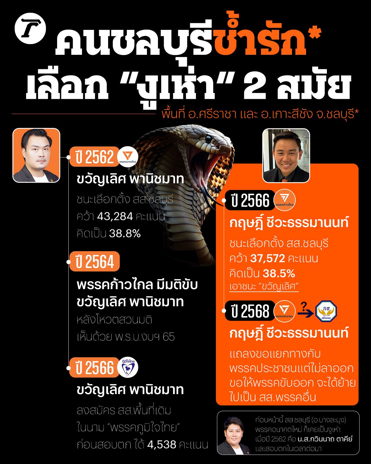 หากย้อนกลับไปไม่กี่ปีก่อนหน้านี้ นี่ไม่ใช่ครั้งแรกที่คนชลบุรี โดยเฉพาะ อ.ศรีราชา และ อ.เกาะสีชัง เผชิญกับการเจอ “งูเห่าสีส้ม” หักหลัง ทรยศปลายปากกาของประชาชน เพราะเมื่อปี 2564 พรรคก้าวไกล (ในขณะนั้น) เคยมีมติขับ นายขวัญเลิศ พานิชมาท สส.ชลบุรี ออกจากพรรค เหตุโหวตสวนมติของฝ่ายค้าน ไปเห็นด้วยกับรัฐบาล ในร่างพระราชบัญญัติงบประมาณรายจ่ายประจำปี พ.ศ.2565 ก่อนถูกขับพ้นพรรคพร้อมกับ สส.อีกหลายราย