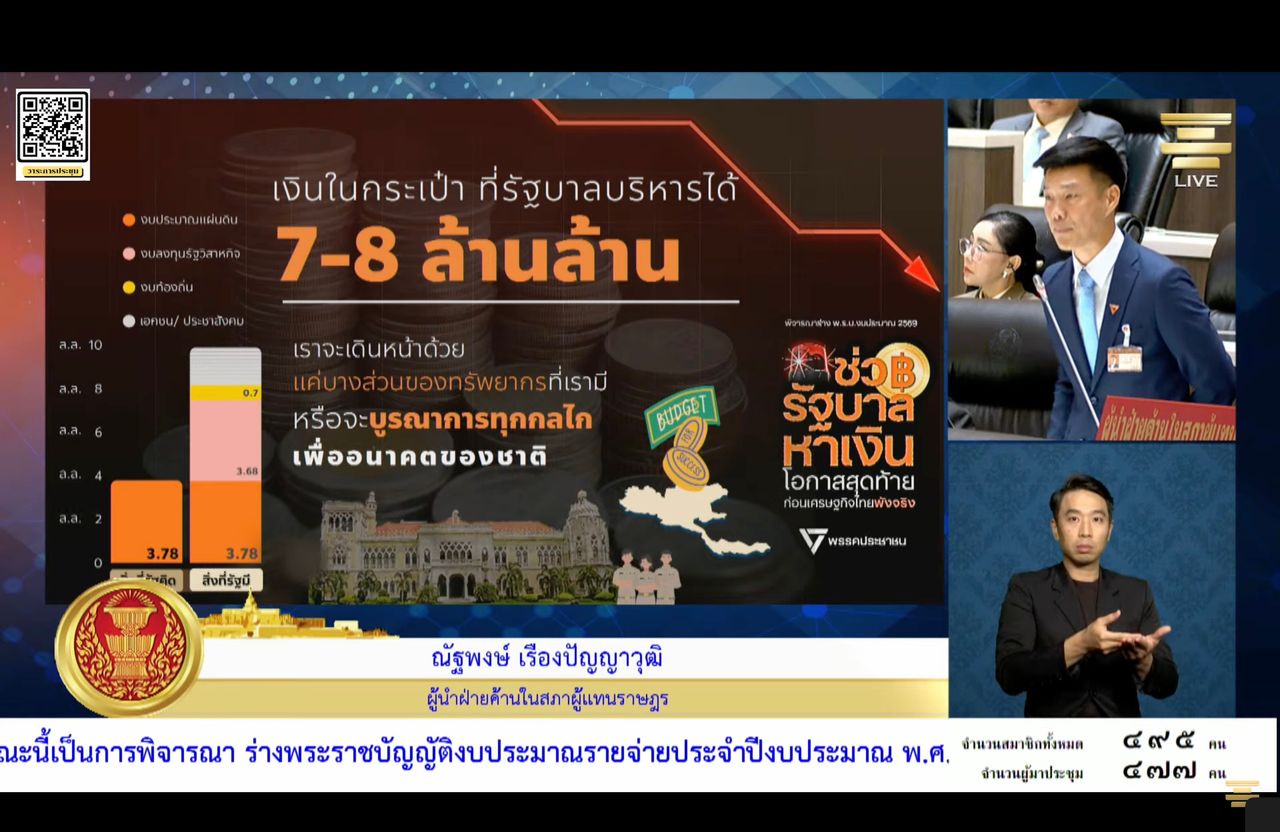 28 พ.ค. 68 ณัฐพงษ์ เรืองปัญญาวุฒิ ผู้นำฝ่ายค้านในสภาผู้แทนราษฎรไทย พรรคประชาชน เริ่มต้นอภิปรายร่าง พ.ร.บ.งบประมาณ 2569 วาระ 1 ว่าด้วยเรื่องภาพรวมงบปี 2569 โดยเขากล่าวว่า นี่เป็นปีที่ 2 ติดต่อกันแล้วที่พรรคเพื่อไทยตั้งงบขาดดุลจนสูงเกือบชนเพดาน โดยกำหนดกรอบงบประมาณรายจ่ายไว้ที่ 3.78 ล้านล้านบาท ขณะที่มีการประมาณการรายได้ของรัฐไว้เพียง 2.92 ล้านล้านบาท ส่งผลให้ต้องกู้เพื่อชดเชยการขาดดุล 8.6 แสนล้านบาท คิดเป็น 4.5% ต่อจีดีพี ไม่เพียงเท่านั้น ปี 2568 รัฐบาลเพื่อไทยเคยทำสถิติไว้ว่า ท่านกู้เพื่อชดเชยการขาดดุลเป็นสัดส่วนต่อจีดีพีที่สูงที่สุดในรอบ 36 ปี นับแต่ปี 2532
