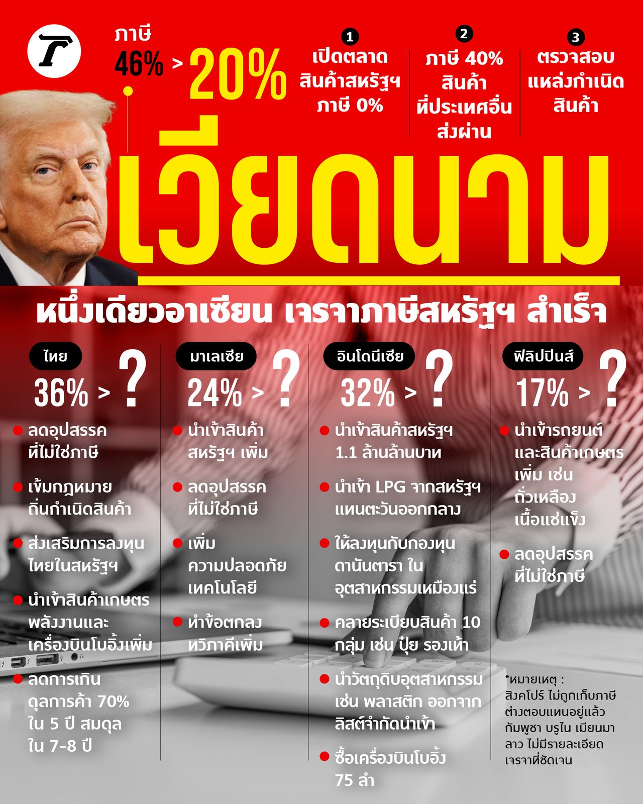 ทั้งนี้ 10 ประเทศอาเซียน ต่างโดนเก็บภาษีในอัตราที่ต่างกันไป โดยสูงที่สุดคือกัมพูชา ที่ 49% ขณะที่ไทย ถูกเก็บ 36% ซึ่งในช่วงที่ผ่านมาแต่ละประเทศต่างเดินหน้ายื่นข้อเสนอเจรจาของตัวเอง แต่ล่าสุดมีเพียง "เวียดนาม" ที่บรรลุข้อตกลงได้ รายละเอียดเป็นอย่างไร ไทยรัฐออนไลน์ รวบรวม