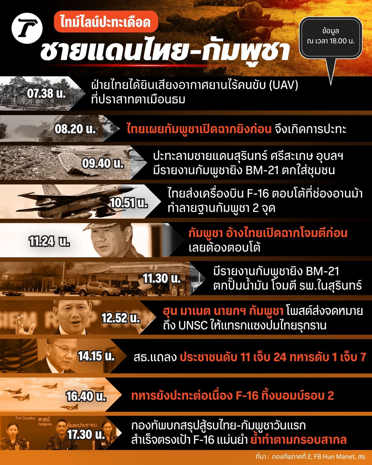 17.30 น. : พล.ต.วินธัย สุวารี โฆษกกองทัพบก แถลงสรุปสถานการณ์ไทยปะทะกัมพูชาวันแรก สำเร็จตรงเป้า ยันดำเนินการตามกรอบสากล มุ่งทำลายเป้าหมายทางทหารเท่านั้น ส่วนปฏิบัติการ F-16 จำนวน 2 รอบ แม่นยำ ตอนนี้ยังไม่ได้รับรายงานความสูญเสียของอีกฝ่าย