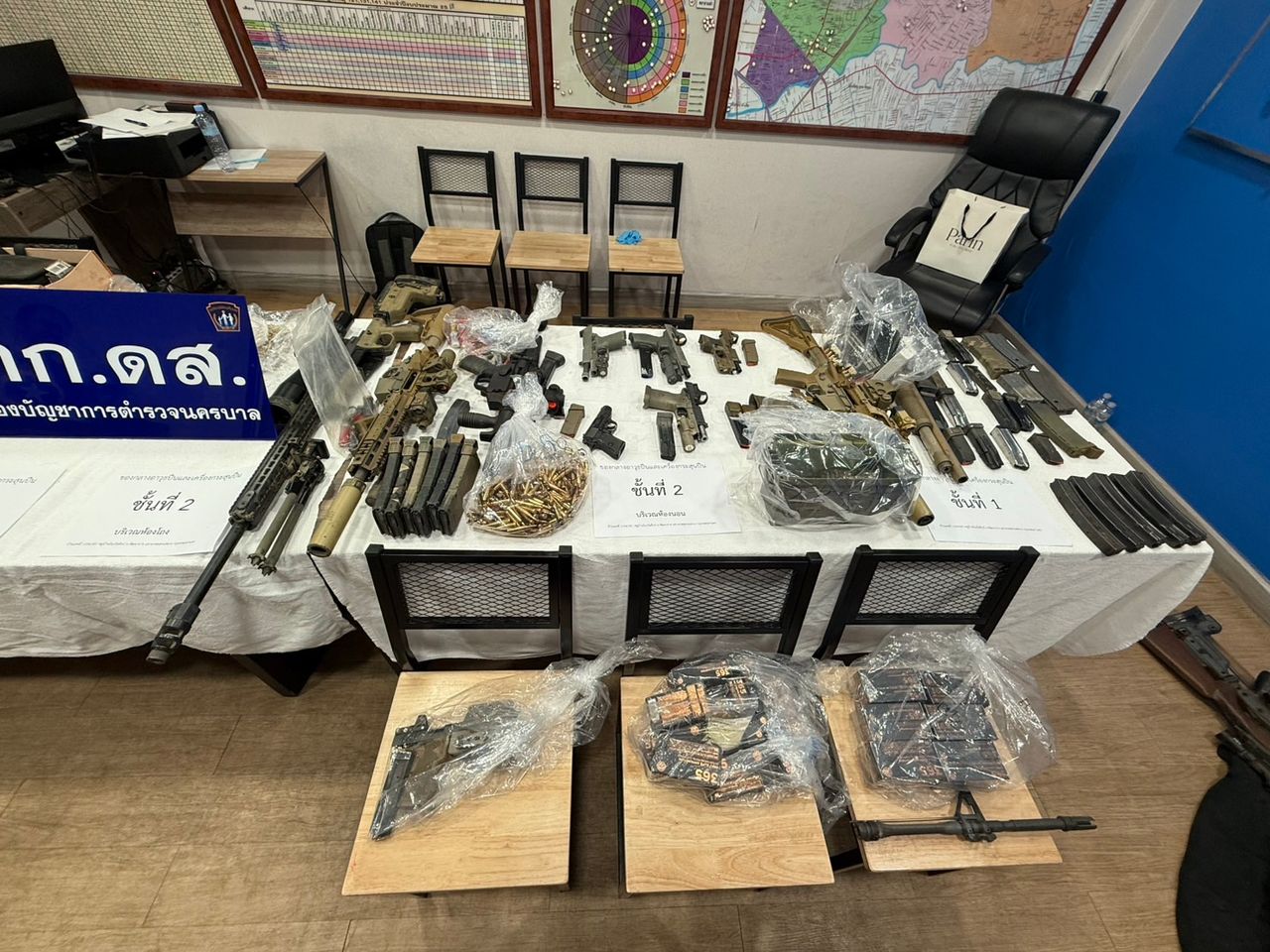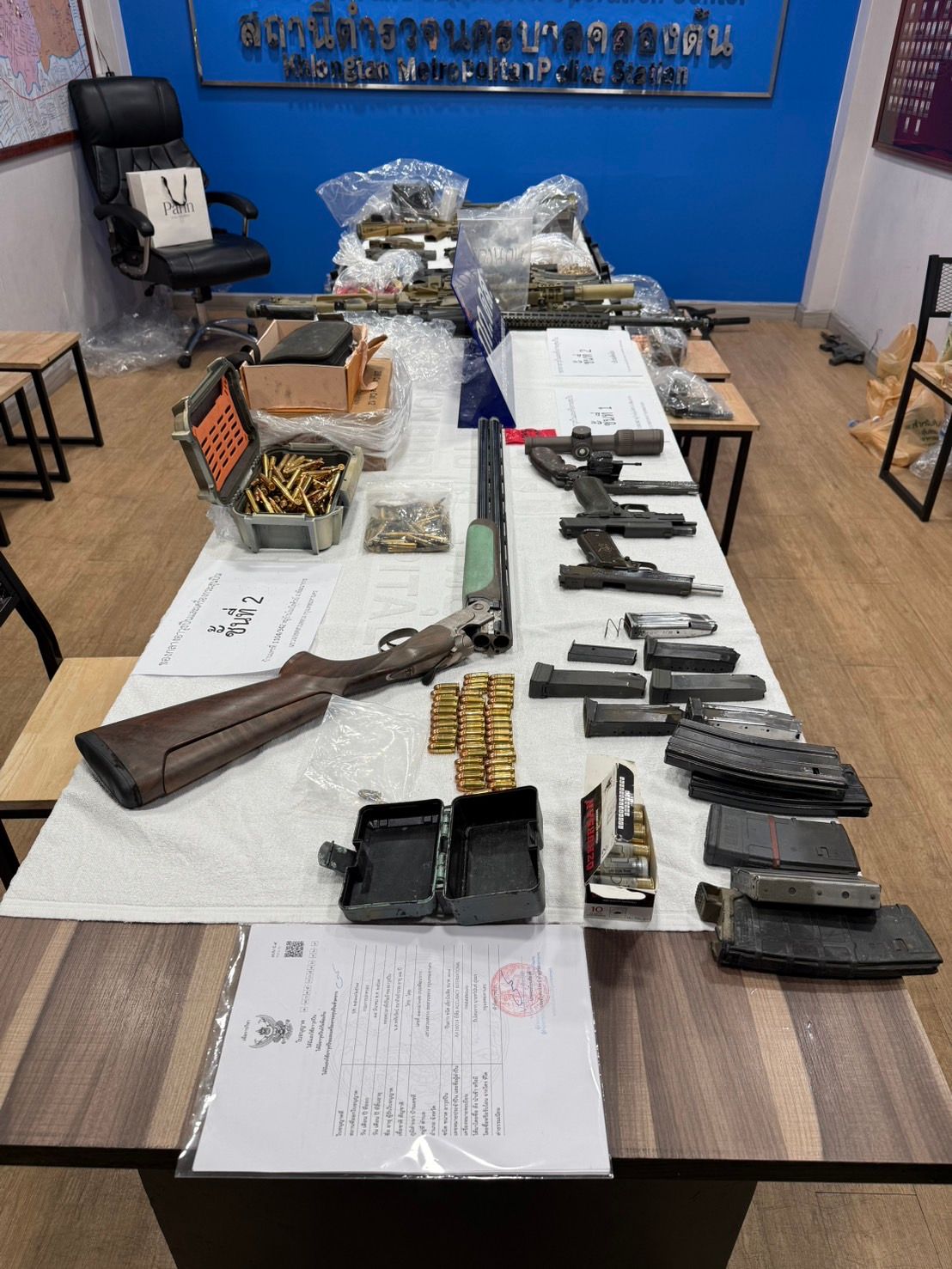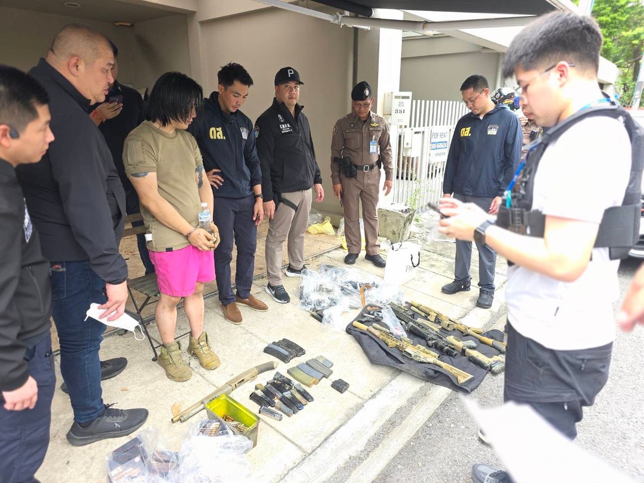 ไฮโซลูกนัท ธนัตถ์ ทายาทนักธุรกิจดัง อดีตนักเคลื่อนไหว ตำรวจนำกำลังบุกรวบพร้อมอาวุธปืนกว่า 20กระบอก กระสุนอีกเพียบ พร้อมยาเสพติด หลังชักปืนตบหน้าเหยื่อสาวบังคับเสพยา โดยตำรวจพบปืนกึ่งอัตโนมัติขนาด 9 มม. 1 กระบอก พร้อมแม็กกาซีนบรรจุกระสุน 13 นัด ใส่ซองพกในเอวด้านขวามือ กระสุนปืนขนาด 5.56 300 นัด 9 มม. 12 กล่องๆ ละ 50 นัด รวม 600 นัด ลำกล้องปืนขนาด 5.56 1 ชิ้น ปืนลูกซอง 1 กระบอก แม็กกาซีนปืนสั้น 16 อัน แม็กกาซีน smg 9 มม. 5 อัน แม็กกาซีน ปลย.(AR) 5 อัน กระสุนขนาด .308 60 นัด กระสุนขนาด 5.56 267 นัด กระสุนขนาด 9 มม. 10 กล่องๆ ละ 50 นัด รวม 500นัด กระสุนขนาด 9 มม. 42 นัด กระสุนปืนลูกซองเบอร์ 12 34 นัด สิ่งเทียมอาวุธปืน ประเภทปืนพกสั้น 2กระบอก ประเภทปืนเล็กยาว 3 กระบอก ปืนไฟฟ้า 1 กระบอก ปืนกึ่งอัตโนมัติขนาด 9 มม. พร้อมแม็กกาซีน 4 กระบอก 5 แม็กกาซีน ปืนเล็กยาวขนาด 5.56 1 กระบอก กระสุนปืนลูกซองขนาด 12 7 นัด อุปกรณ์ประกอบการเสพยาไอซ์ 2 ชุด ปืนเล็กยาวขนาด 5.56 1 กระบอก ปืนไรเฟิลขนาด .308 1 กระบอก ปืนกลมือ smg 9 มม. พร้อมแม็กกาซีน 1 กระบอก ปืนสั้น .380 acp พร้อมแม็กกาซีน 1 กระบอก ปืนสั้น .45 พร้อมแม็กกาซีน 1 กระบอก แม็กกาซีน 9 มม. 1 อัน แม็กกาซีนขนาด 5.56 มม. 6 อัน กระสุน 5.56 มม. 71 นัด