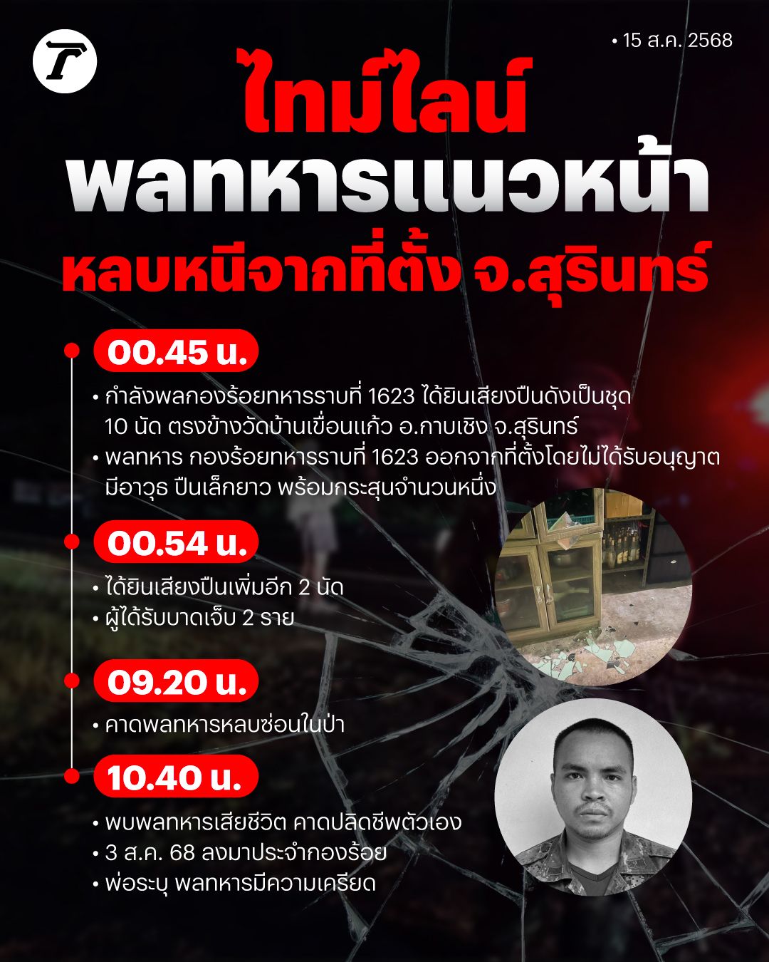 สรุปไทม์ไลน์พลทหารรัวยิง 12 นัด หลบหนีจากที่ตั้ง อ.กาบเชิง จ.สุรินทร์ หลังถอนกำลังมาจากแนวหน้าปราสาทตาควาย ยังระบุสาเหตุไม่ได้ ล่าสุดเสียชีวิตแล้ว