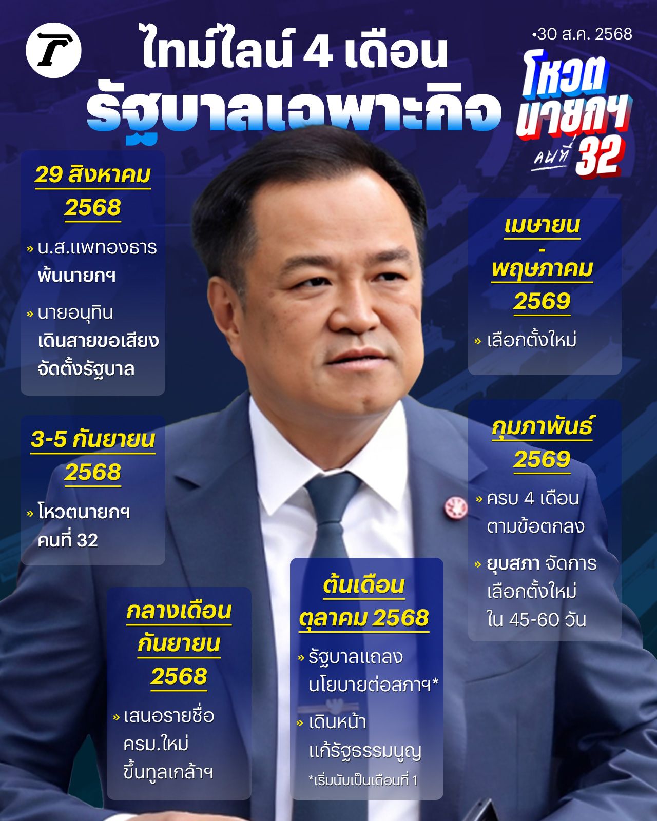 เปิดไทม์ไลน์ 4 เดือน รัฐบาลเฉพาะกิจ พรรคภูมิใจไทย จับมือพรรคประชาชน ทันทีที่อดีตนายกฯ แพทองธารหลุดจากตำแหน่ง หัวหน้าพรรคภูมิใจไทยก็เดินสายดึงเสียงโหวตจัดตั้งรัฐบาลแทนที่แกนนำเก่าอย่างพรรคเพื่อไทย แต่ท่ามกลางเงื่อนไขของพรรคประชาชนที่ยื่นข้อเสนอจะโหวตให้ แต่ต้องยุบสภาภายใน 4 เดือน พร้อมกับต้องแก้ไขรัฐธรรมนูญ โดย สส. พรรคประชาชนจะไม่รับตำแหน่งในรัฐบาล แต่ในช่วงเวลานี้ก็ต้องรอดูการโต้กลับของพรรคเพื่อไทยต่อจากนี้ ว่าภาพฝันรัฐบาลเฉพาะกิจจะเป็นได้จริงหรือไม่