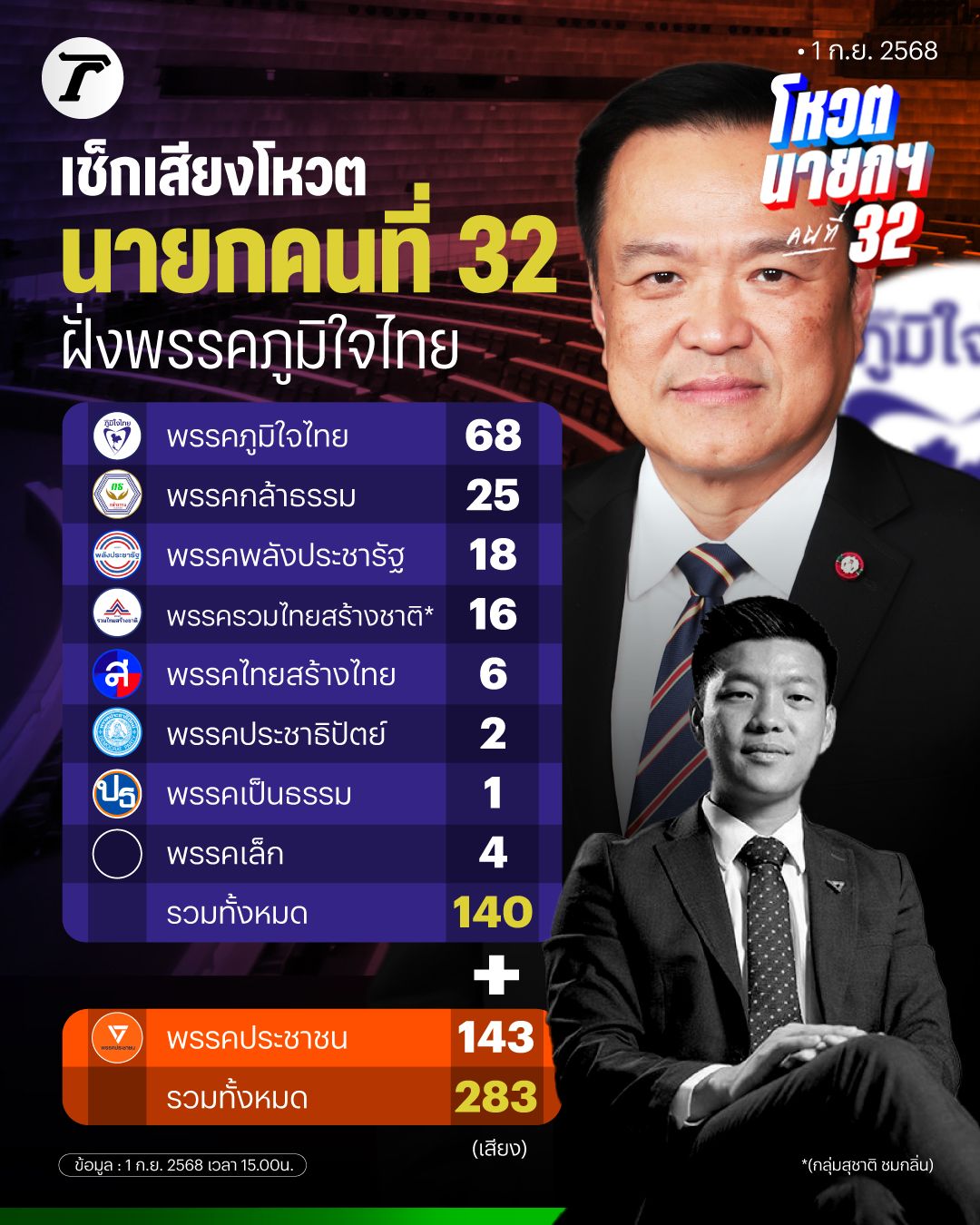 เช็กเสียงโหวตหนุน อนุทิน ชาญวีรกูล นั่งนายกคนที่ 32 เปิดสูตร 140 เสียง + พรรคประชาชน ได้รวม 283เสียง เกินครึ่งของ สส. สภาฯ พร้อมอ้าแขนรับ "เพื่อไทย” ไหลเติม