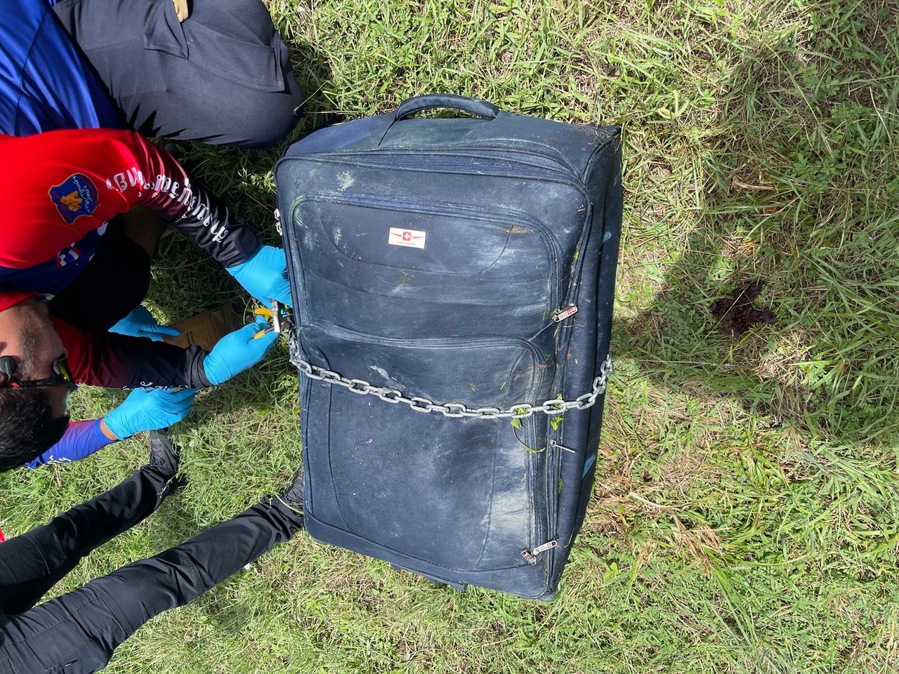 ที่เกิดเหตุเป็นอ่างเก็บน้ำขนาดใหญ่ จากการตรวจสอบเบื้องต้น พบกระเป๋าเดินทางขนาดใหญ่ สีดำ มีโซ่เหล็กพันล้อมรอบกระเป๋า ล็อกด้วยแม่กุญแจ โซ่ถูกรัดทับด้วยสายเคเบิลไทร์ 4 จุด และจุดล็อกซิปกระเป๋า 1 จุด ภายในกระเป๋ามีกลิ่นเน่าพวยพุ่งออกมา