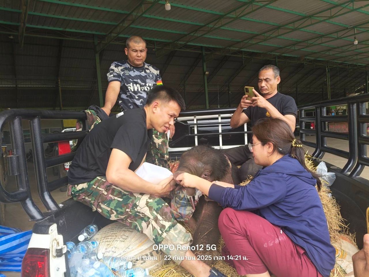 ช่วงเช้าวันที่ 22 กันยายน 2568 ลูกช้างดังกล่าวมีอาการดีขึ้น มีแรงมากขึ้น สามารถลุกนั่งได้จากการช่วยพยุงโดยทีมสัตวแพทย์และ จนท. อช.ลำคลองงู แต่ยังไม่สามารถลุกยืนด้วยตนเองได้ จึงทำการป้อนน้ำข้าวต้มสุก ผสมนมผง ทุก ๆ 2-3 ชม.