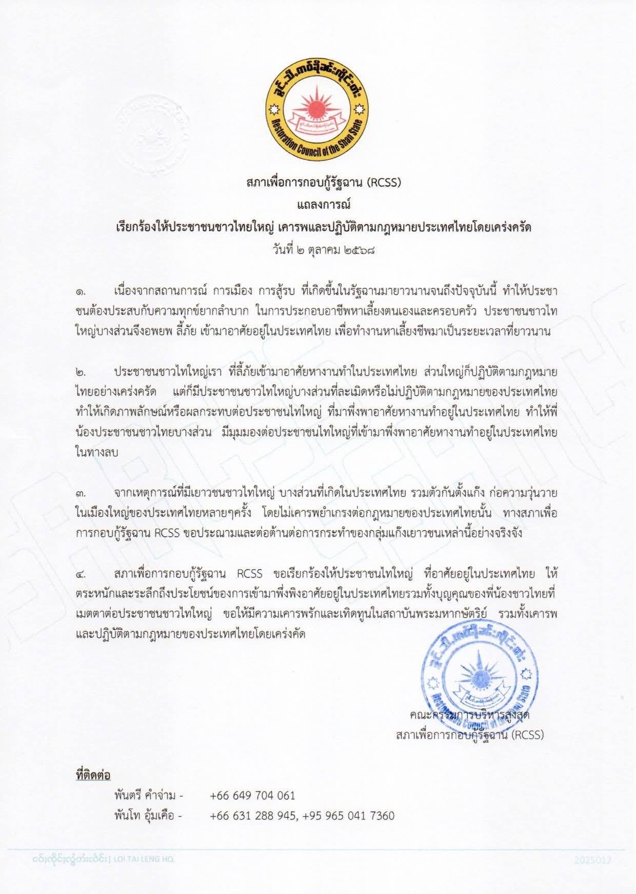 สภาเพื่อการกอบกู้รัฐฉาน (RCSS) แถลงการณ์ เรียกร้องให้ประชาชนชาวไทใหญ่ เคารพและปฏิบัติตามกฎหมายไทยโดยเคร่งครัด วันที่ 2 ต.ค.68