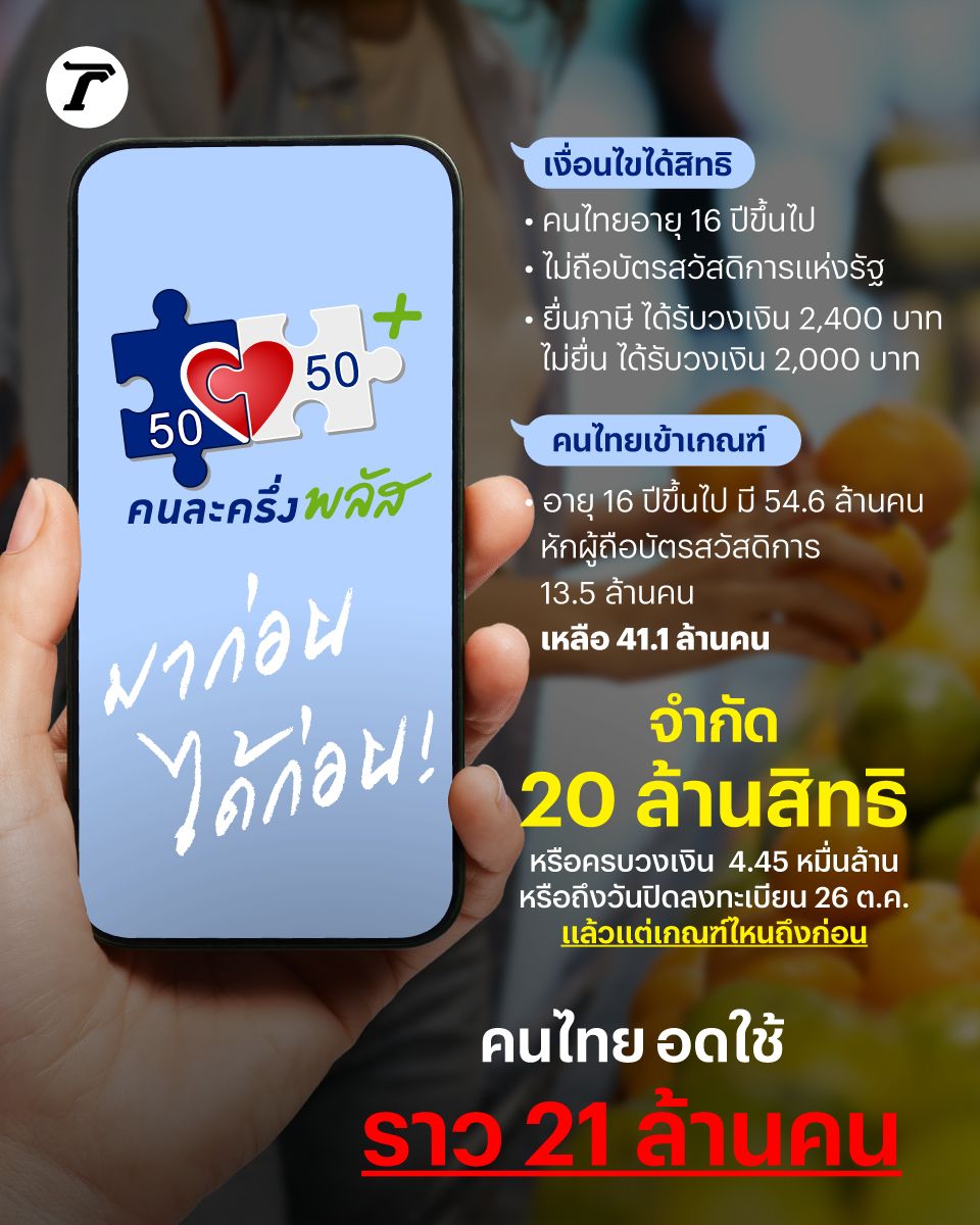 “คนละครึ่งพลัส” จำกัด 20 ล้านสิทธิ ลงทะเบียนก่อนได้ก่อน คาด 21 ล้านคนอดใช้ "กระทรวงการคลัง" เชื่อครอบคลุม ช่วยกระตุ้นเศรษฐกิจได้ 0.3-0.4% ของ GDP