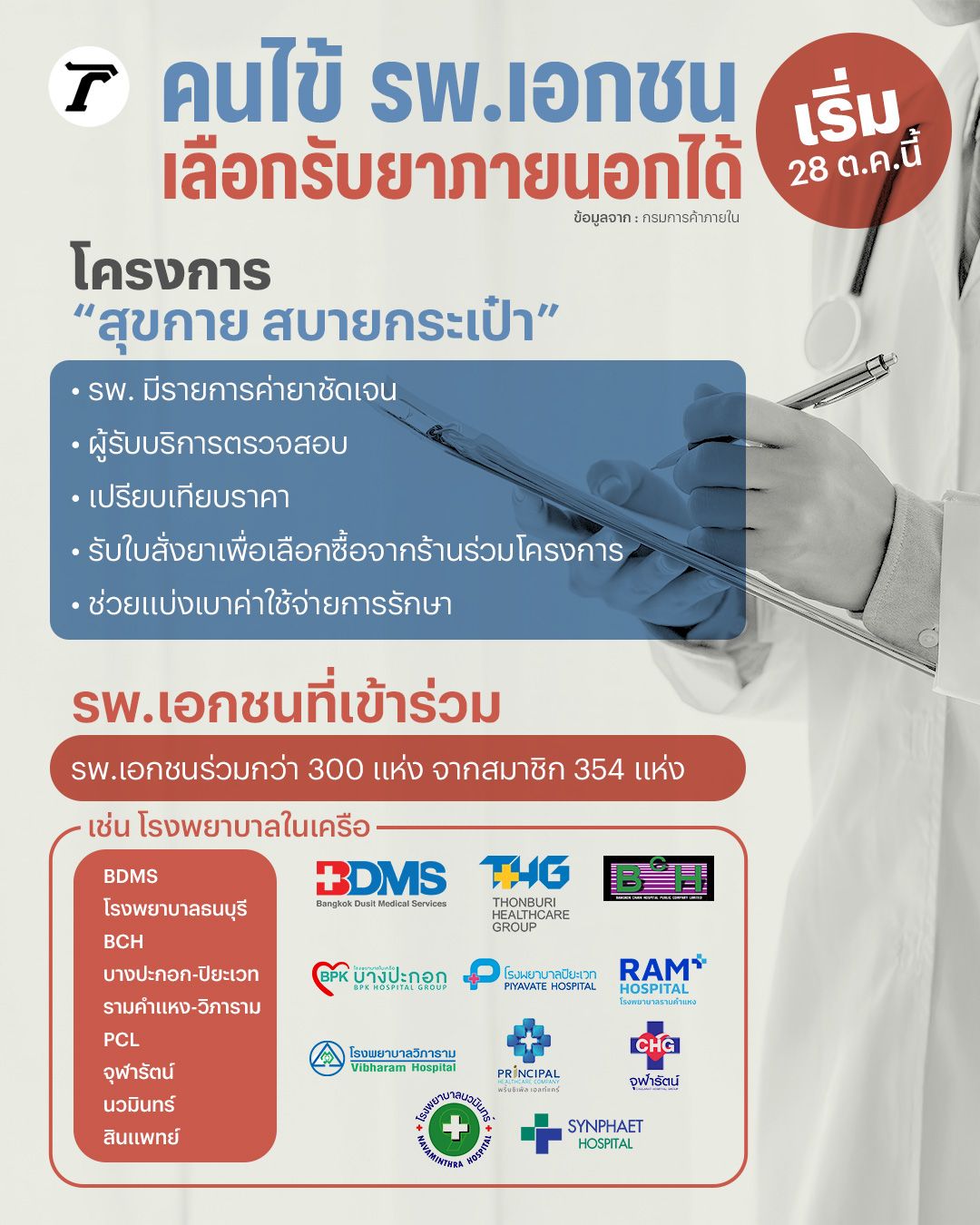 โครงการ "สุขกาย สบายกระเป๋า” เริ่ม 28 ต.ค.นี้ คนไข้ รพ.เอกชน เลือกได้ว่าจะไปซื้อยาภายนอก รพ.เอกชนกว่า 300 แห่ง ที่เข้าร่วมโครงการ