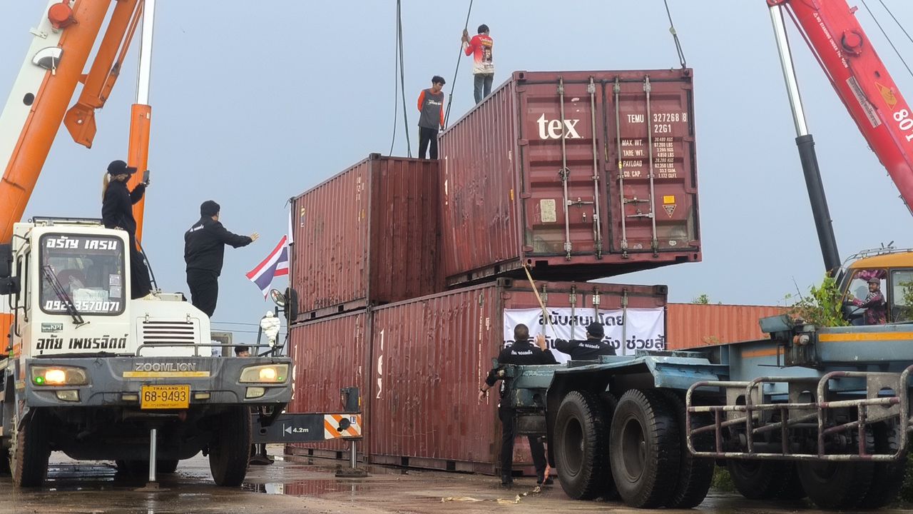 เวลา 09.58 น. ขบวนตู้คอนเทนเนอร์ ของ “กัน จอมพลัง” ทยอยมาถึงพื้นที่ชายแดนบ้านหนองจาน โดยลอตแรกมาทั้งหมด 20 คันรถ จำนวนตู้คอนเทนเนอร์ 40 ตู้ เพื่อทำกำแพงกั้นแนว พร้อมป้ายไวนิล “ตู้นี้เป็นการสนับสนุนโดยมูลนิธิ กัน จอมพลังช่วยสู้" บอกว่าข้อความนี้เปรียบเสมือนยันต์กันกัมพูชา โดยมีการติดตั้งกล้องวงจรปิด รวมถึงมีเจ้าหน้าที่เฝ้าและลาดตระเวนด้านบนตู้คอนเทนเนอร์ตลอด 24 ชั่วโมง
