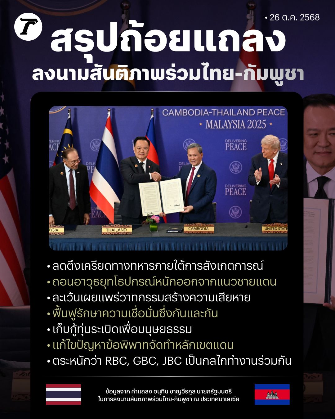 สรุปถ้อยแถลง ลงนามสันติภาพร่วมไทย-กัมพูชา ณ มาเลเซีย โดยมีโดนัลด์ ทรัมป์ เป็นสักขีพยาน ยืนยันลดตึงเครียด ถอนอาวุธหนักริมชายแดน พร้อมเก็บกู้ระเบิด แก้ปัญหาข้อพิพาทหลักเขตแดน ร่วมกันสองฝ่าย