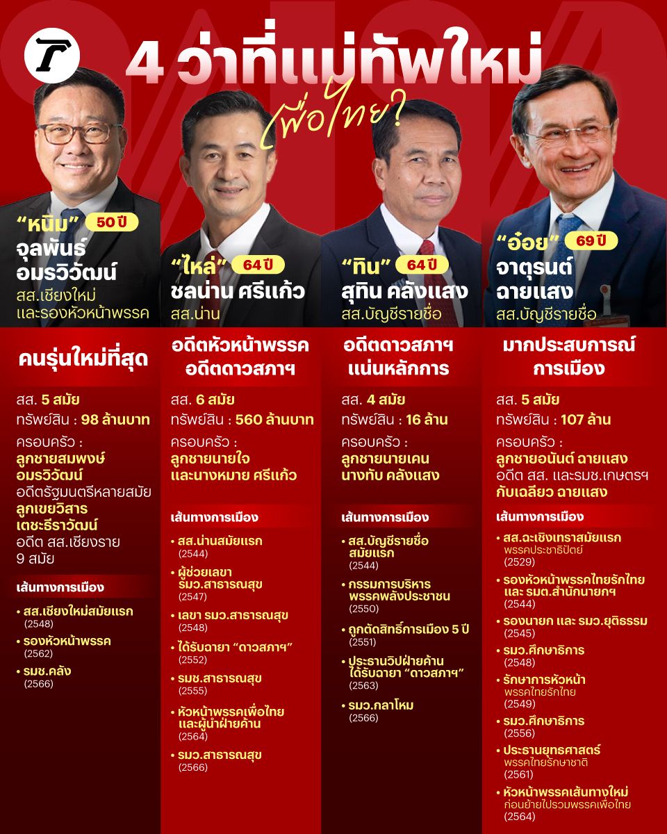 มีอยู่ 4 คนที่สื่อมวลชนให้ความสนใจอยู่ในขณะนี้ ประกอบด้วย จุลพันธ์ อมรวิวัฒน์ อดีต รมช.คลัง และรองหัวหน้าพรรค, นพ.ชลน่าน ศรีแก้ว อดีต รมว.สาธารณสุข และอดีตหัวหน้าพรรค, สุทิน คลังแสง อดีต รมว.กลาโหม และ จาตุรนต์ ฉายแสง อดีตรัฐมนตรีหลายสมัย ไปดูว่าแต่ละคนมีเส้นทางการเมืองเป็นอย่างไรกันบ้าง