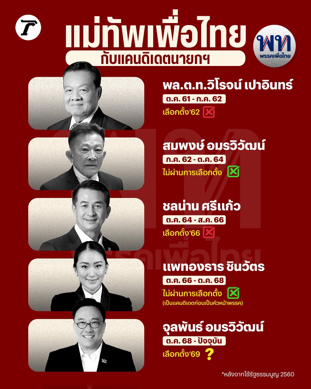 ย้อนกลับไปในเส้นทางการเมืองของพรรคเพื่อไทย นับตั้งแต่มีการบังคับใช้ รัฐธรรมนูญ 2560 ซึ่งเปลี่ยนโฉมหน้าการเลือกตั้งไทยไปอย่างสิ้นเชิง กลับพบรูปแบบที่น่าสนใจประการหนึ่ง นั่นคือ "หัวหน้าพรรค" ไม่ได้มีสถานะเท่ากับแคนดิเดตนายกรัฐมนตรีในบัญชีที่พรรคเสนอต่อคณะกรรมการการเลือกตั้ง (กกต.) โดยพรรคเพื่อไทยเป็นพรรคที่แทบไม่ใช้งานหัวหน้าพรรคมาเป็นแคนดิเดตนายกฯ เลย ตั้งแต่การเลือกตั้งใหญ่เมื่อปี 2562 และ 2566 ซึ่งคาดว่าการเลือกตั้งครั้งต่อไป ก็อาจจะไม่ได้มีพลิกไปจากแนวทางเดิม