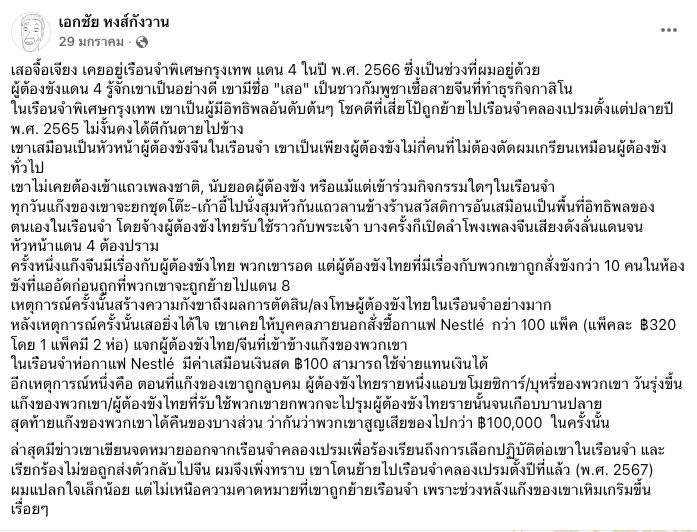 ก่อนหน้านี้เมื่อช่วงเดือน ม.ค.68 ที่ผ่านมา นายเอกชัย หงส์กังวาน นักเคลื่อนไหวทางการเมือง ซึ่งเคยถูกคุมขังที่เรือนจำพิเศษกรุงเทพฯ (ปัจจุบันถูกย้ายไปเรือนจำคลองเปรม) ได้โพสต์เฟซบุ๊ก เล่าประสบการณ์ถูกคุมขังในเรือนจำพร้อมกับผู้ต้องขังจีนเทา ซึ่งรวมถึงบิ๊กบอสชเวโก๊กโก่ อย่าง “แส จิ้นเจียง” ผู้ต้องหาตามหมายแดง ซึ่งถูกจับกุมและเคยถูกคุมขังที่เรือนจำพิเศษกรุงเทพฯ