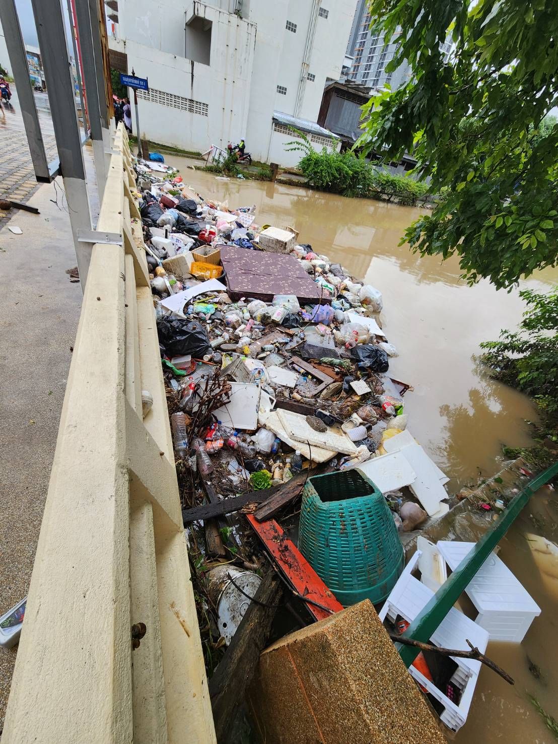 จากการสำรวจในพื้นที่หาดใหญ่พบว่า ตรงคอสะพานแทบทุกที่จะมีเศษขยะขวางทางน้ำจำนวนมาก ทำให้น้ำไหลออกไปได้ช้า ขณะเดียวกันในช่วงที่น้ำท่วมรอบแรก แล้วนึกว่าน้ำจะไม่ท่วมอีกก็เลยเริ่มจัดเก็บบ้าน ซึ่งก็มีชาวบ้านบางส่วนเอาขยะไปทิ้งในลำน้ำทำให้การระบายน้ำช้าลงไปอีก