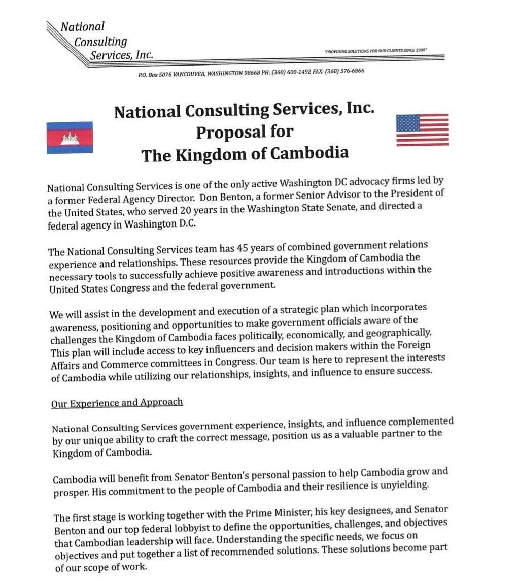 ลงนามด้วยลายเซ็นของนายคอย กวง เอกอัครราชทูตกัมพูชาประจำสหรัฐฯ และนายโดนัลด์ เอ็ม. เบนตัน ประธานบริษัท National Consulting Services, Inc. กำหนดให้มีผลตั้งแต่วันที่ 1 มีนาคม 2025 - พฤษภาคม 2026 รวมเป็นระยะเวลา 15 เดือน ด้วยค่าตอบแทนเดือนละ 38,000 ดอลลาร์สหรัฐฯ (ราว 1.2 ล้านบาท)