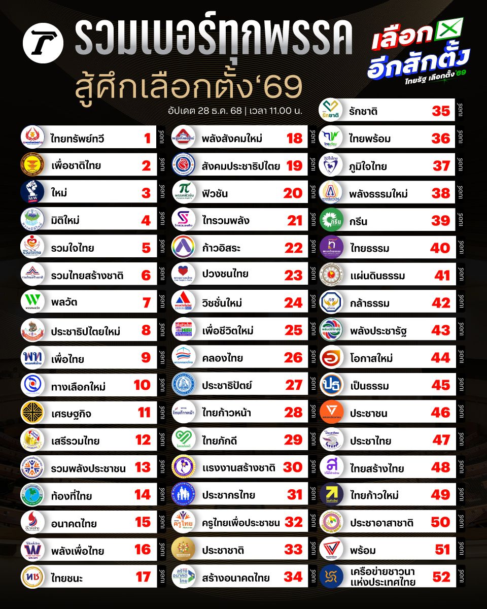 เปิดหมายเลขหาเสียง เบอร์ปาร์ตี้ลิสต์ 52 พรรค เลือกตั้ง 2569 ใครได้หมายเลขอะไรบ้าง