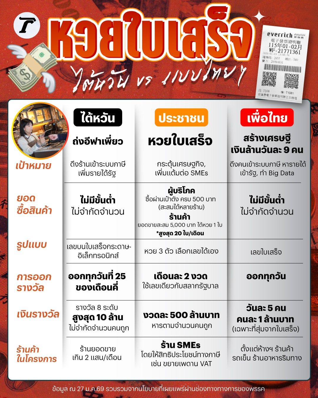 ส่องโมเดล “หวยใบเสร็จไต้หวัน” รางวัลใหญ่กว่า 10 ล้านบาท กระตุ้นเศรษฐกิจ ดึงคนเข้าระบบภาษี ต้นแบบนโยบายพรรคประชาชน - เพื่อไทย เหมือนและแตกต่างกันอย่างไร?