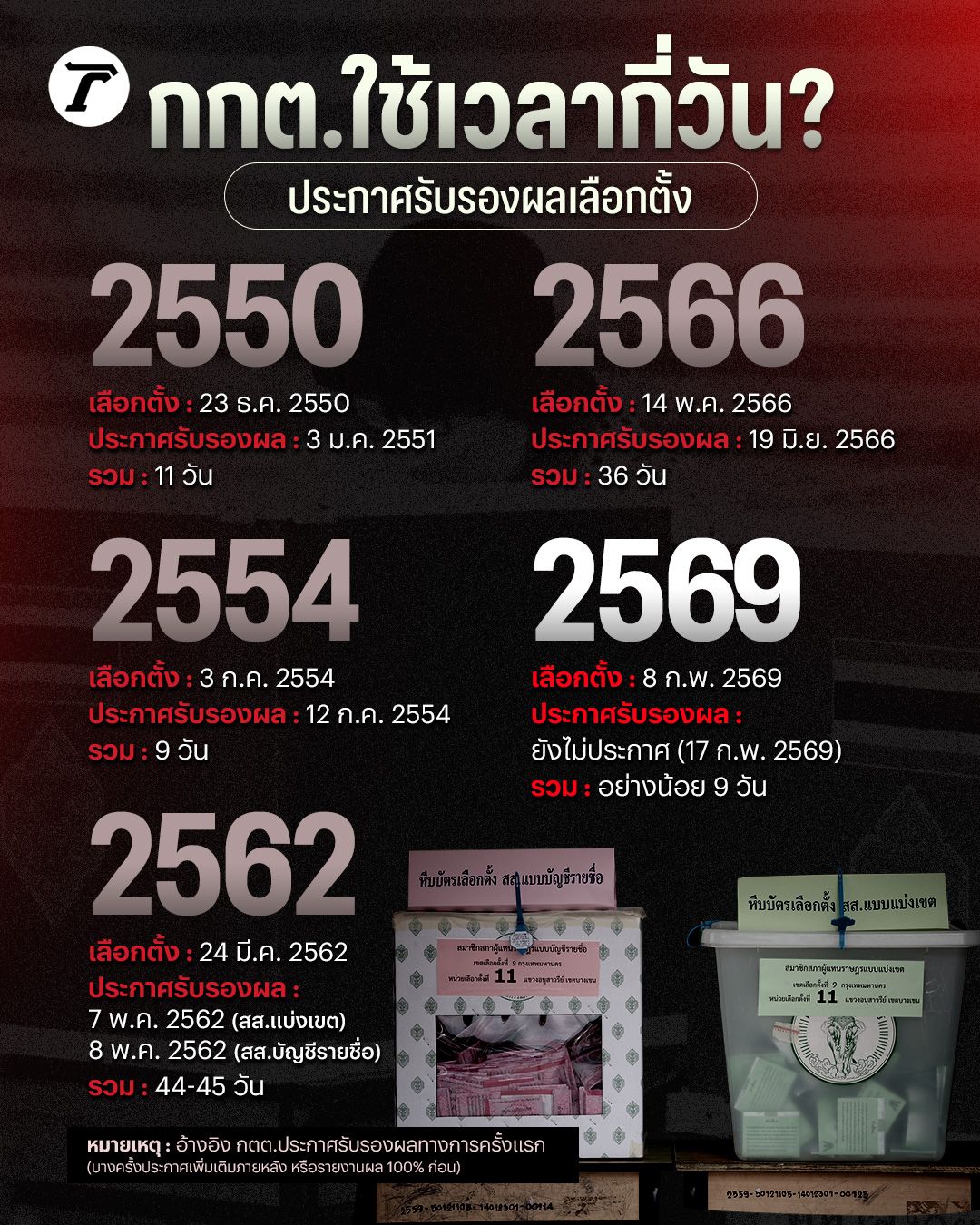 ย้อนดูการเลือกตั้งไทย 2550-2569 กกต.ใช้เวลากี่วัน ในการประกาศรับรองผลอย่างเป็นทางการ ล่าสุดฝ่ายการเมือง-ภาคประชาชน เดินหน้าร้องเอาผิด กกต. ยื่นศาลระงับรับรองผล