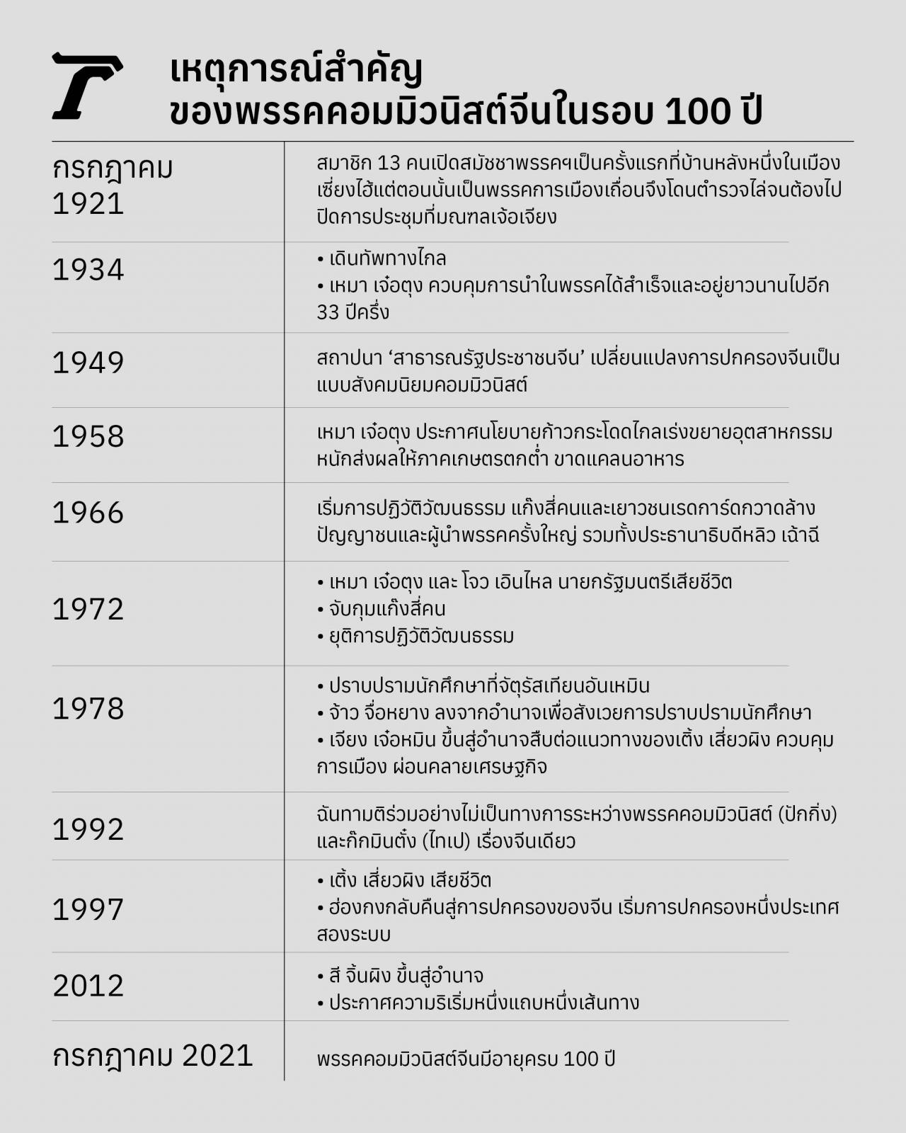 - พรรคคอมมิวนิสต์จีนก่อตั้งโดยคนแค่ 13 คนเมื่อเดือนกรกฎาคม 1921 ผ่านเหตุการณ์สำคัญมากมาย ก่อตั้งเป็น ‘สาธารณรัฐประชาชนจีน’ ในปี 1949 และในปี 2021 พรรคคอมมิวนิสต์มีอายุครบ 100 ปี เมื่อวันที่ 1 กรกฎาคมที่ผ่านมา