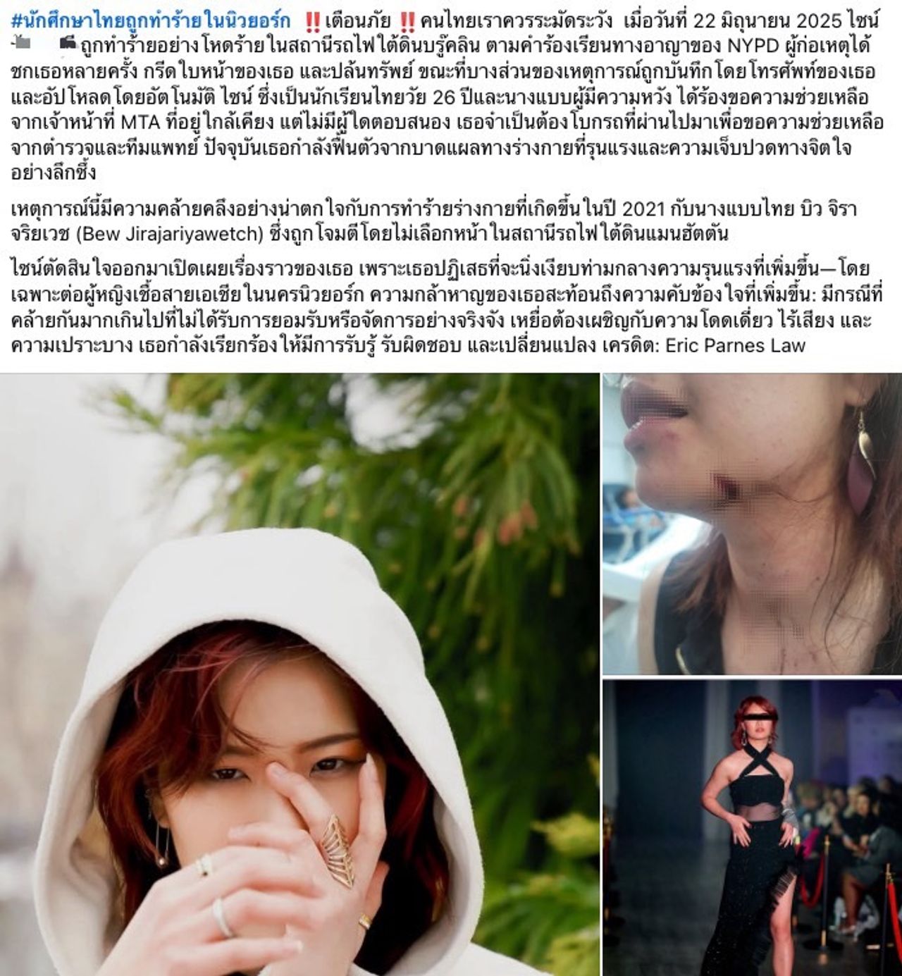 ผู้ใช้เฟซบุ๊กรายหนึ่งโพสต์แจ้งข่าวเตือนภัยคนไทยในต่างประเทศว่า เมื่อวันที่ 22 มิ.ย.ที่ผ่านมา ไซน์ (สงวนนามสกุล) นางแบบและนักศึกษาไทยวัย 26 ปี ถูกทำร้ายและปล้นที่สถานีรถไฟใต้ดินในนิวยอร์ก สหรัฐฯ โดยคนร้ายได้กรีดใบหน้า และชกเข้าที่ใบหน้าหลายครั้ง โดยเหตุการณ์บางส่วนถูกบันทึกโดยโทรศัพท์ของเธอและอัปโหลดโดยอัตโนมัติ ไซน์ได้ร้องขอความช่วยเหลือจากเจ้าหน้าที่ MTA (เจ้าหน้าที่ดูแลความปลอดภัยในระบบขนส่ง) ที่อยู่ใกล้เคียง แต่ไม่มีผู้ใดตอบสนอง เธอจำเป็นต้องโบกรถเพื่อไปขอความช่วยเหลือจากตำรวจและทีมแพทย์
