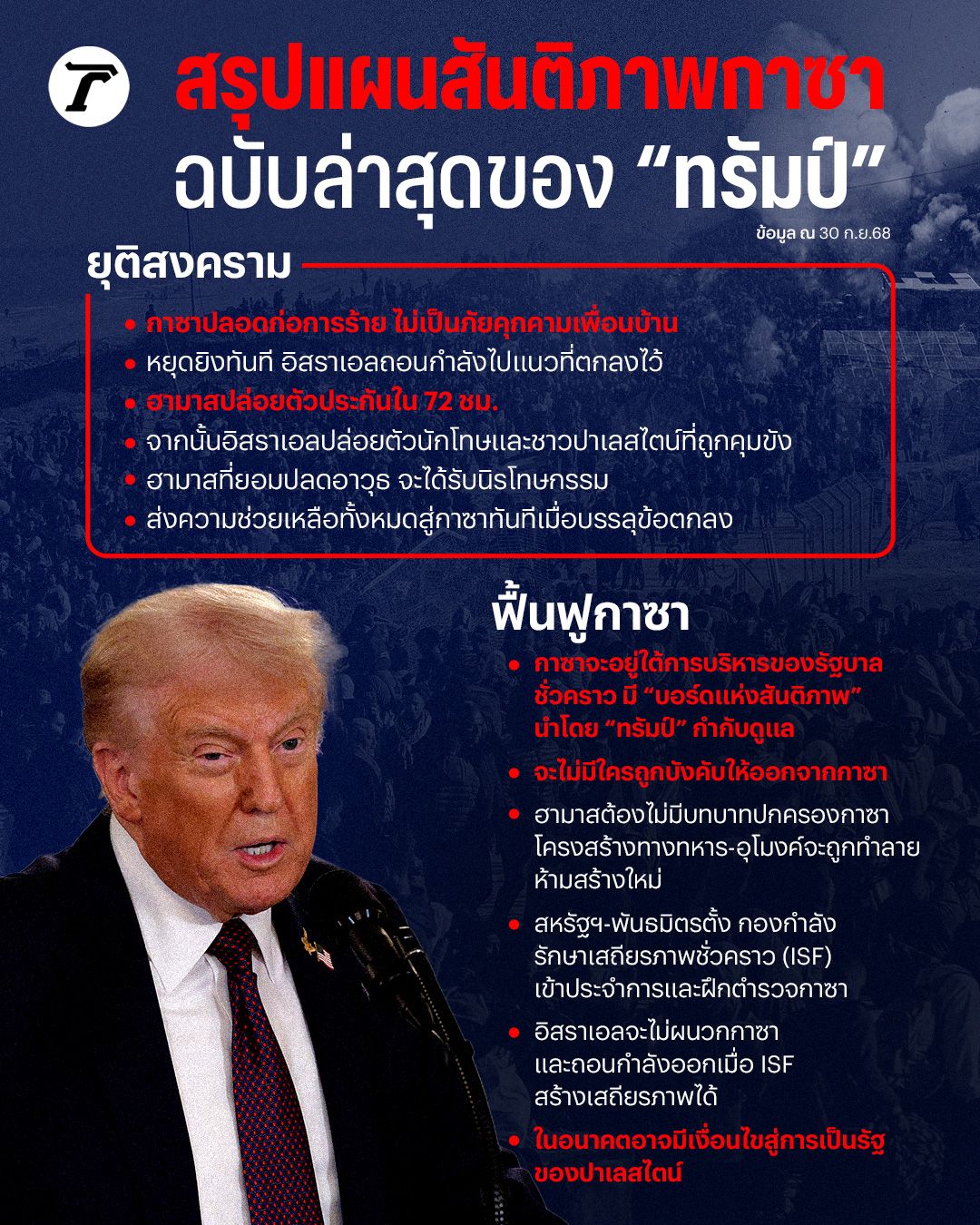 วันที่ 29 ก.ย.ที่ผ่านมา ประธานาธิบดีโดนัลด์ ทรัมป์ เปิดเผยแผนสันติภาพ 20 ข้อ เพื่อยุติสงครามในฉนวนกาซา หลังการพบปะหารือกับนายกฯ เบนจามิน เนทันยาฮู ของอิสราเอล ที่ทำเนียบขาว ซึ่งทางผู้นำอิสราเอลได้ตอบตกลงข้อเสนอดังกล่าวแล้ว พร้อมระบุว่า
