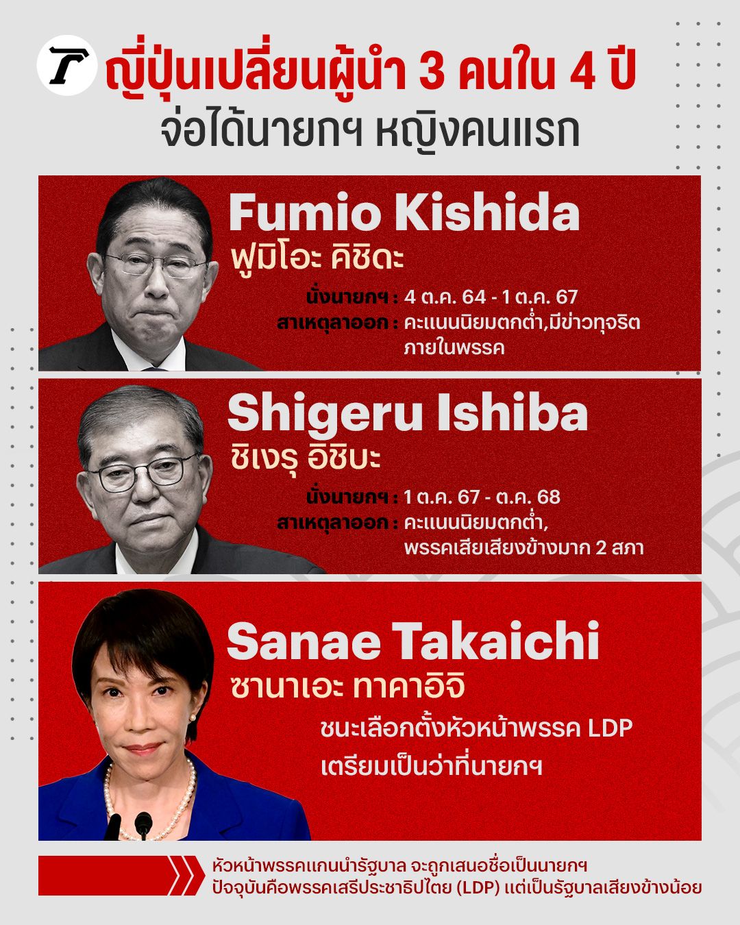 ญี่ปุ่น เปลี่ยนผู้นำคนที่ 3 ในรอบ 4 ปี หลังนายกฯ อิชิบะ ลาออก "ซานาเอะ ทาคาอิจิ" ได้รับเลือกเป็นหัวหน้าพรรค LDP คนใหม่ มีโอกาสเป็นนายกฯ หญิงคนแรก ท่ามกลางวิกฤตความนิยมพรรค LDP ตกต่ำ