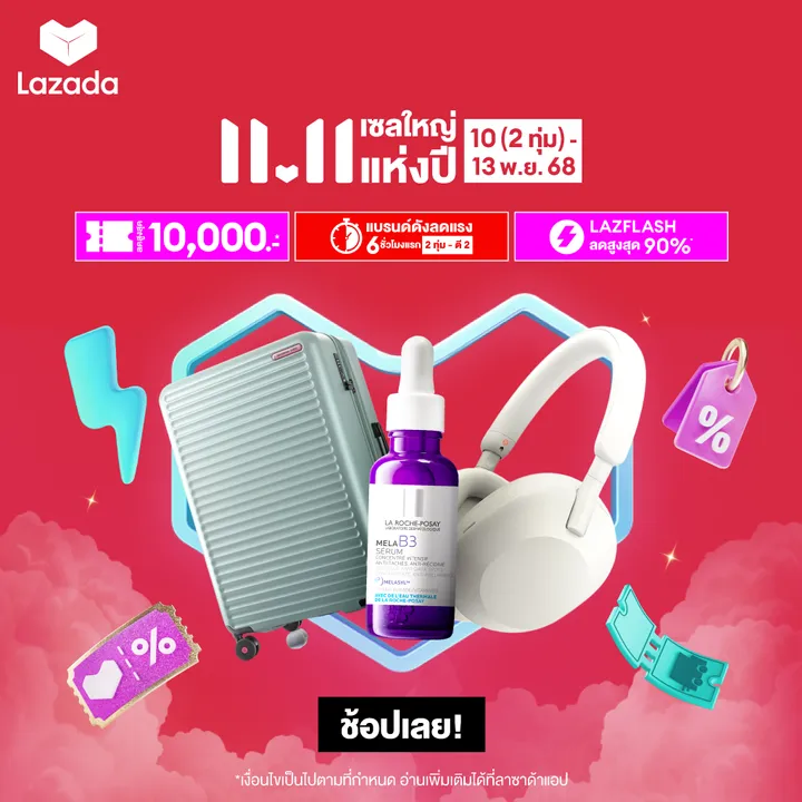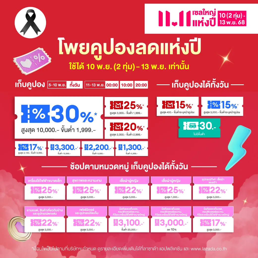 ในเดือนพฤศจิกายน 2568 นี้ Lazada มาพร้อมคูปองส่วนลดต่างๆ มากมาย ภายใต้แคมเปญ Lazada 11.11 Big Sale of The Year เซลใหญ่แห่งปี มหกรรมเซลที่ขนขบวนเอาสินค้าแบรนด์ดังมาลดราคากันแบบจัดเต็ม พร้อมด้วยคูปองส่วนลดอีกมากมาย เช่น ส่วนลดสูงสุด 10,000 บาท ส่วนลด 3,300 บาท รวมถึงคูปองส่งฟรี และส่วนลดจากพาร์ตเนอร์บัตรเครดิต ติดตามได้ที่นี่