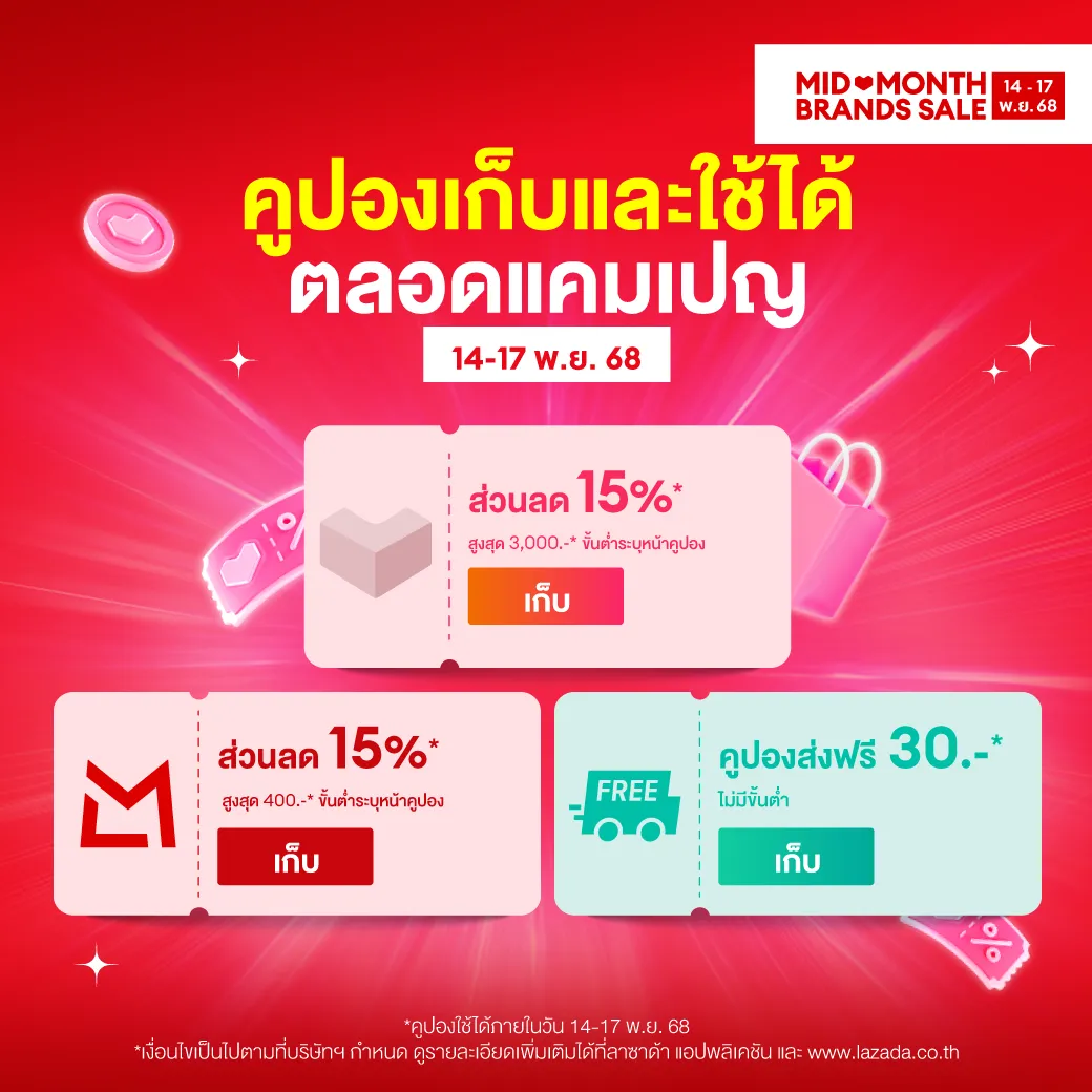 สำหรับโปรโมชันกลางเดือน Lazada กลับมาพร้อมแคมเปญใหญ่ Lazada Mid Month Sale 11.15 ช็อปสุดคุ้มกับดีลเด็ดตลอด 3 วันเต็ม สินค้าลดสูงสุดถึง 90% พร้อมแจกคูปองส่วนลดจากแพลตฟอร์มสูงสุด 3,000 บาท และคูปองจากร้านค้าสูงสุด 20% พร้อม Lazada ช่วยเปย์ สูงสุดถึง 70% และคูปองส่งฟรี เตรียมตัวเก็บโค้ดและช็อปกันให้จุใจระหว่างวันที่ 15 - 17 พฤศจิกายน 2568