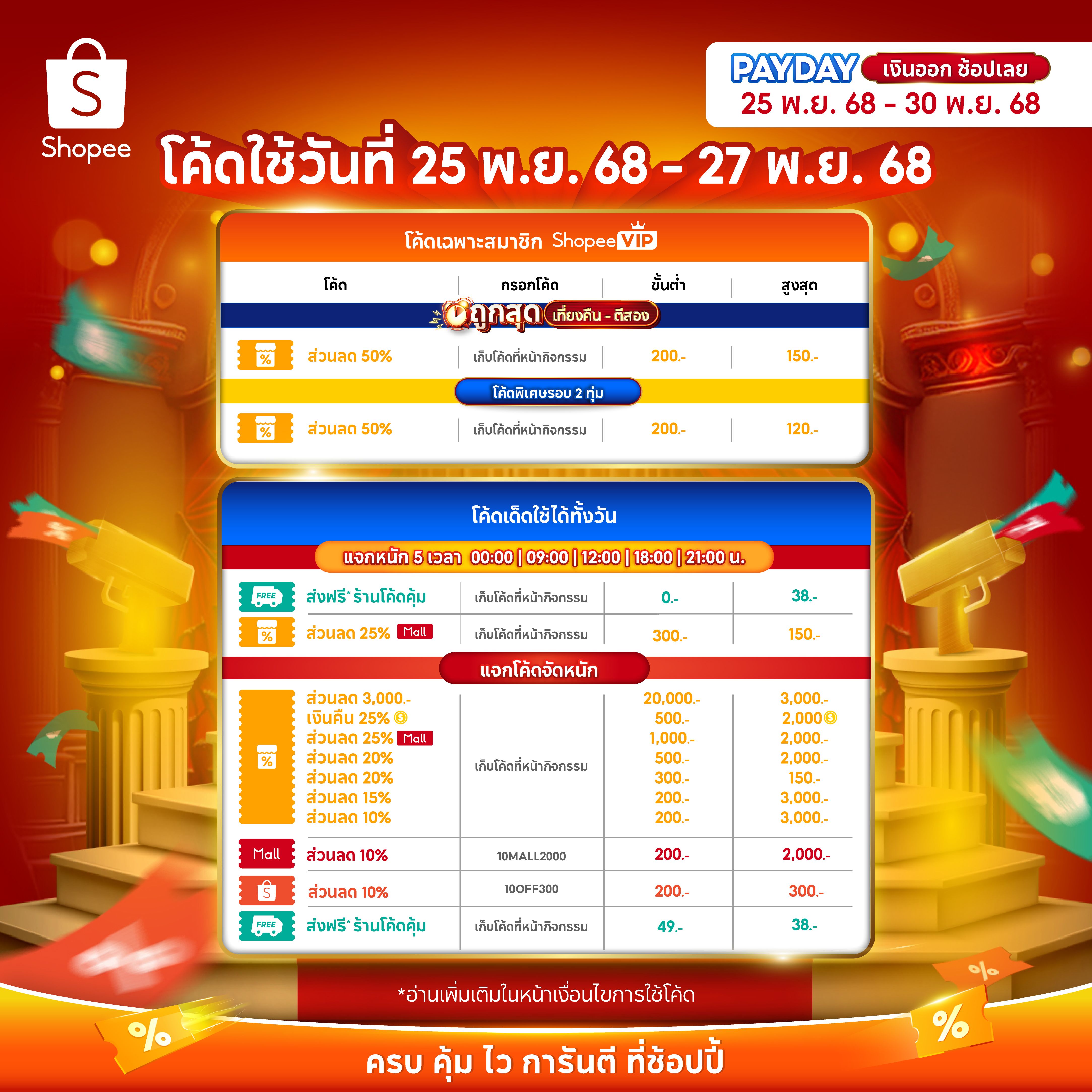 ช่วงท้ายเดือนพฤศจิกายนแบบนี้ ใครที่กำลังวางแผนช็อป หรือเตรียมซื้อของขวัญ ไม่ควรพลาดกับ Shopee 11.25 Payday เงินออก ช็อปเลย พบกับสินค้าจากหลากหลายแบรนด์ดังที่ลดราคากว่า 70% มาพร้อมกับโค้ดรับเงินคืน และโค้ดส่วนลดส่งฟรี เก็บโค้ดและช็อปพร้อมกันได้ตั้งแต่วันที่ 25-30 พ.ย. 2568 นี้
